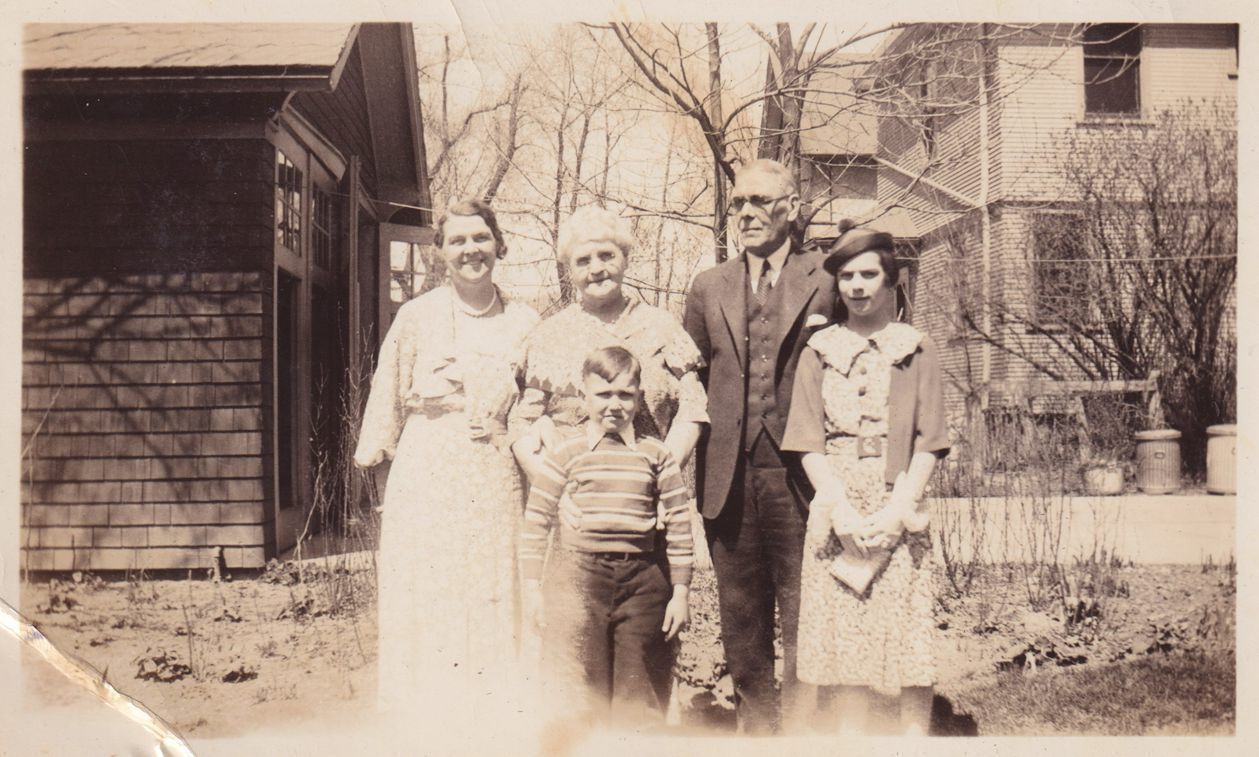 Black-and-White photograph of Irene Weishel, Abbie Jane Jones, D. Edward Jones, young Irene Weishel, and Edward Weishel in front. In 1934, the Jones Family took a long road trip that included stopping at Blair's parent's home in LaGrange, IL.