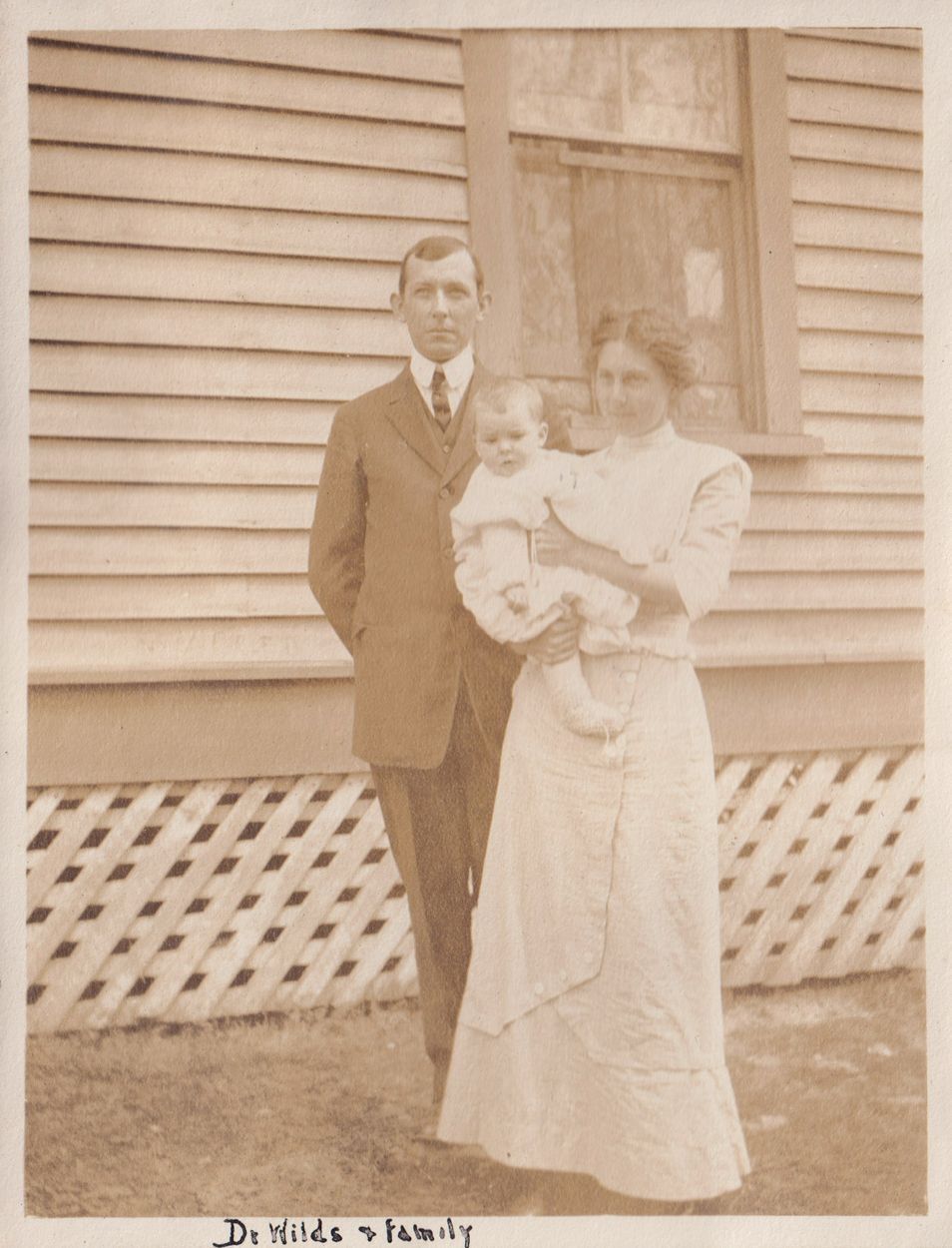 Black-and-white photograph of a man and woman standing together, while the woman holds a baby. They are standing in front of the side of a house. "Dr Wilds + Family" is written in ink beneath the photograph.