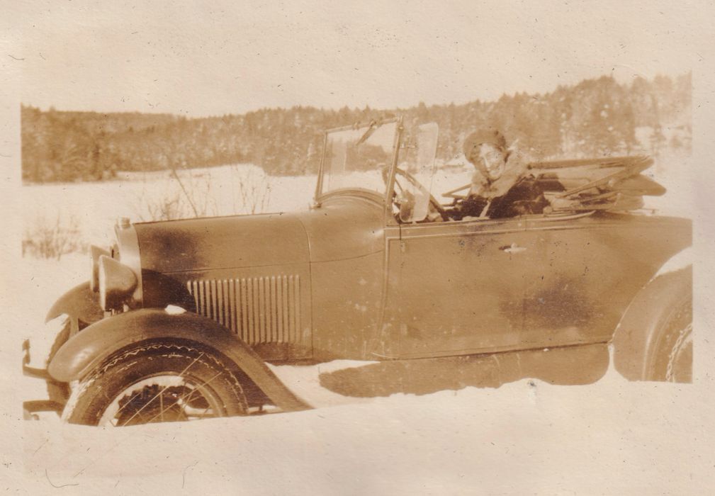 Black-and-White photograph of Dora Danforth [later Mrs. N. Loring.], of Buffalo, NY, in an open-top car in the snow. The photograph may have been taken at Ampersand Bay.
