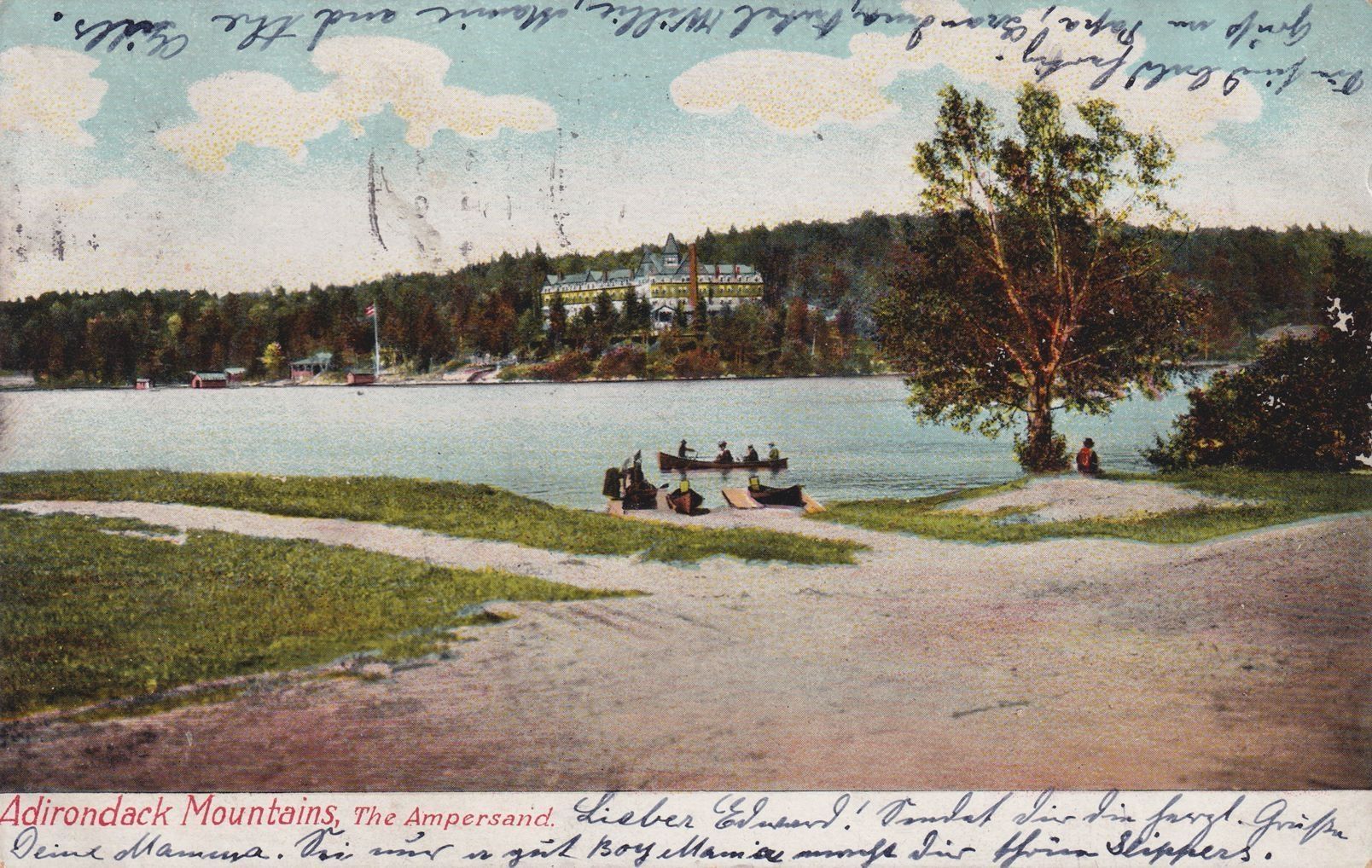 Color postcard showing a view of the Ampersand Hotel from across Lower Saranac Lake. People can be seen in boats on the water. Printed caption on front reads, "Adirondack Mountains, the Ampersand." Printed by Hugh C. Leighton Co., Portland, ME. Used, undivided back, white space at bottom front for message, postmarked Saranac Lake, October 3, [year missing].