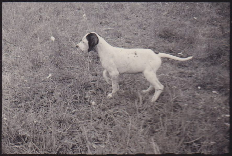 Black-and-White photograph of a dog standing on point. Printed from a contact sheet.