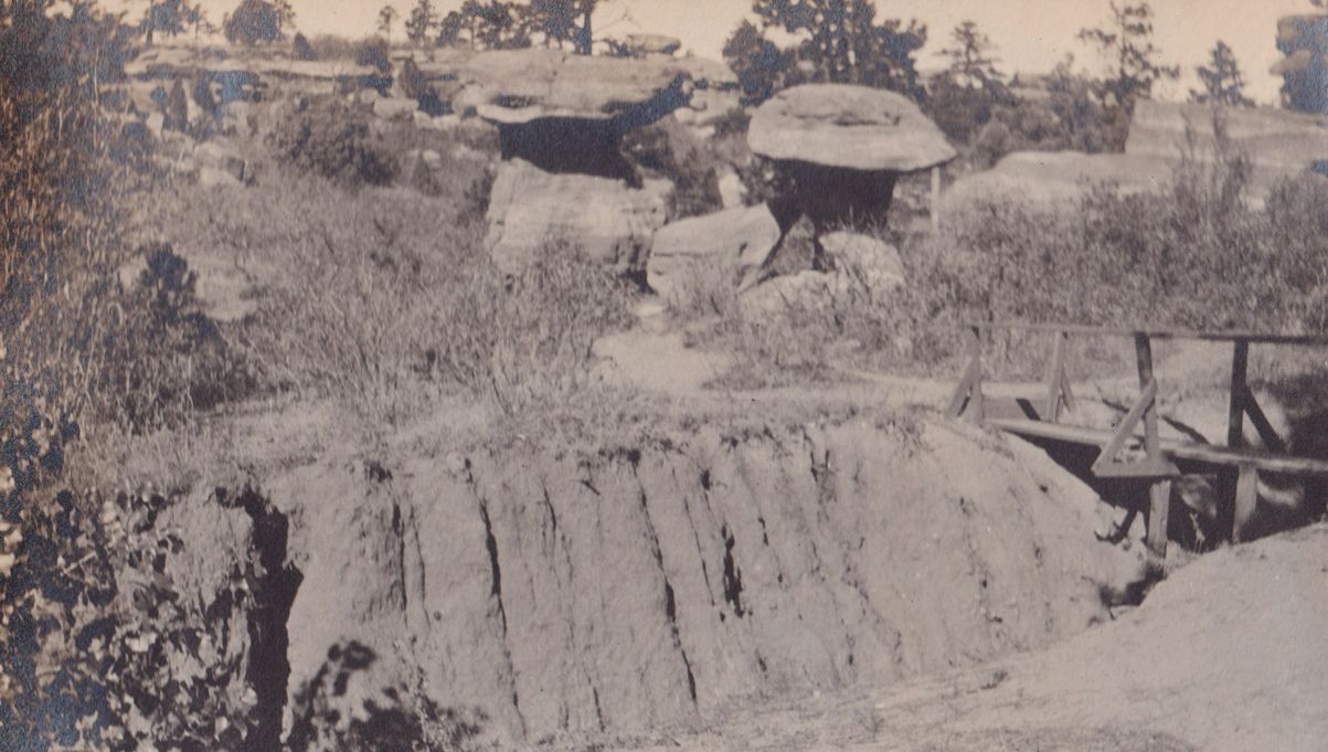 Black-and-white photograph of perhaps a dried riverbed, as hinted by the small wooden bridge on the right side of the picture. There are rock structures across the bridge from the photographer.