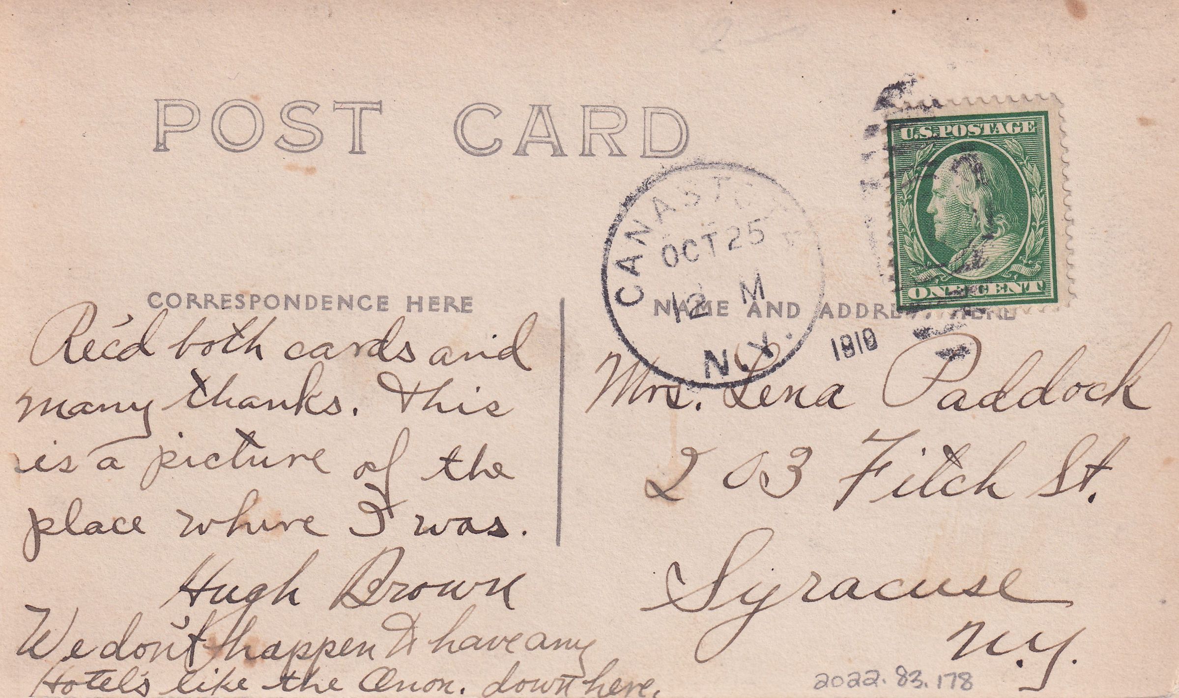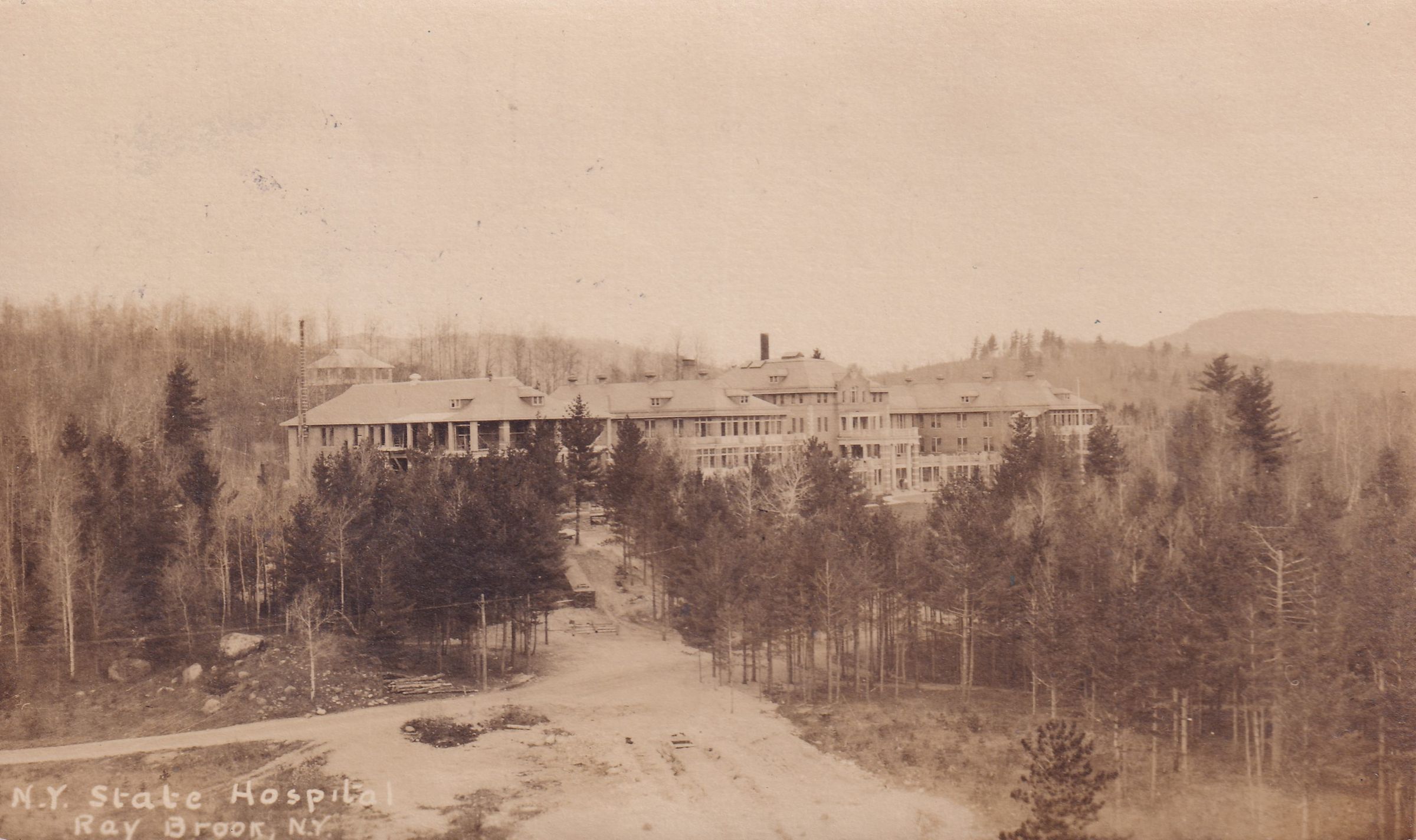 Photograph postcard showing a view of the Main Building at the New York State Hospital for Incipient Tuberculosis, AKA Ray Brook Sanatorium, as seen from the “back road.” Printed caption on front reads, “N. Y. State Hospital, Ray Brook, N. Y.” No photographer’s mark. Used, divided back, postmarked Canastota, NY, October 25, 1910. Handwritten message on back reads, “Rec’d both cards and many thanks. This is a picture of the place where I was. Hugh Brown. We don’t happen to have any hotels like the Anon. down here.” Mailed to Mrs. Lena Paddock, 23 Fitch St., Syracuse, NY.Subject Place