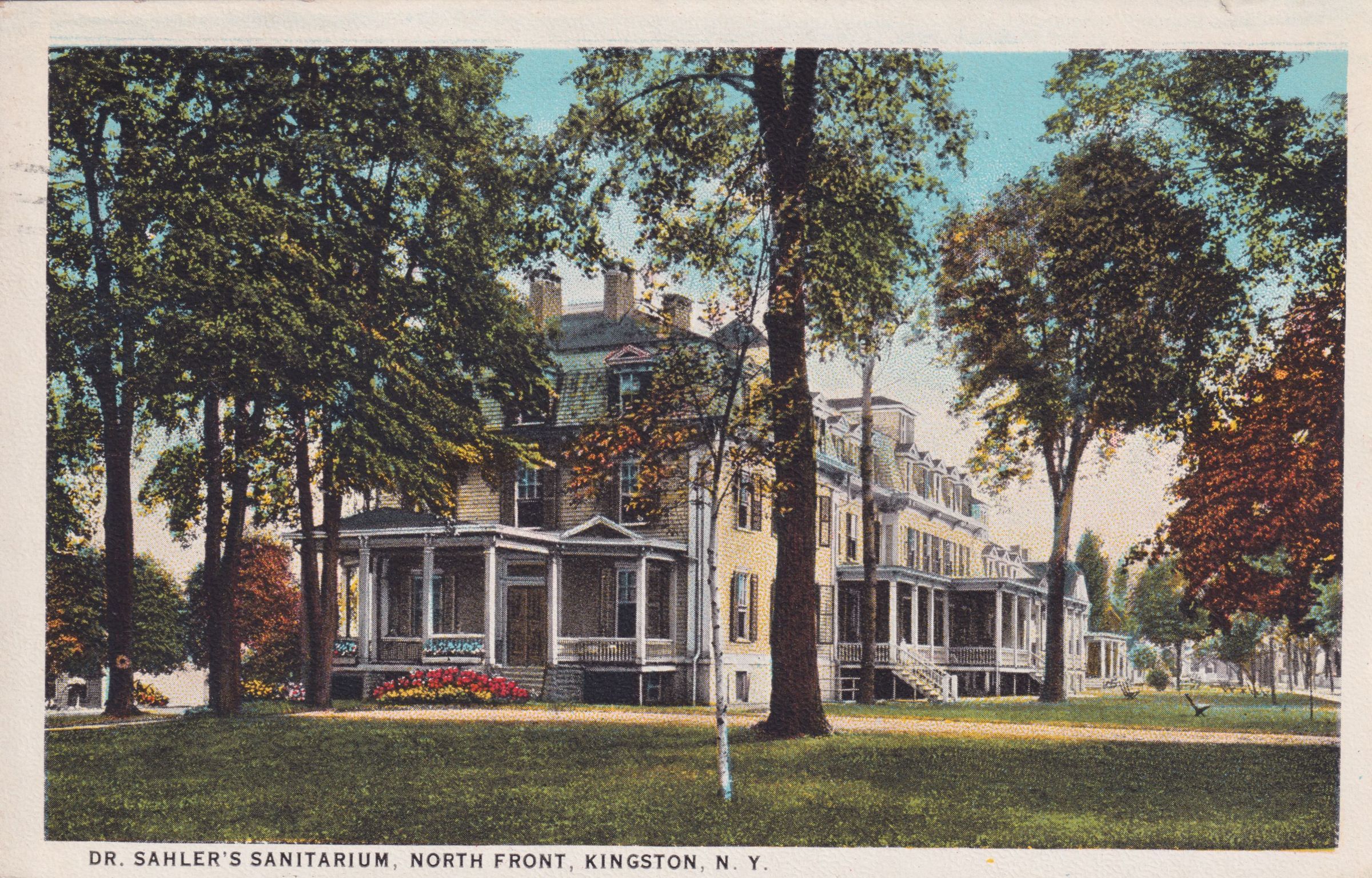 Color postcard showing a large, Second-Empire style building through the trees. Printed caption on the front reads, "Dr. Sahler's Sanitarium, North Front, Kingston, N.Y." Used, divided back, postmarked Kingston, NY, July 15, 1930. Printed by the Kingston Souvenir Co., Kingston, NY. Handwritten message on the back reads, "Dear Lillian, Just here for a couple of days - Emma." Mailed to Mr. & Mrs. Edward Droms [?], 1927 Albany St., Schenectady, NY, Ulster.Collection