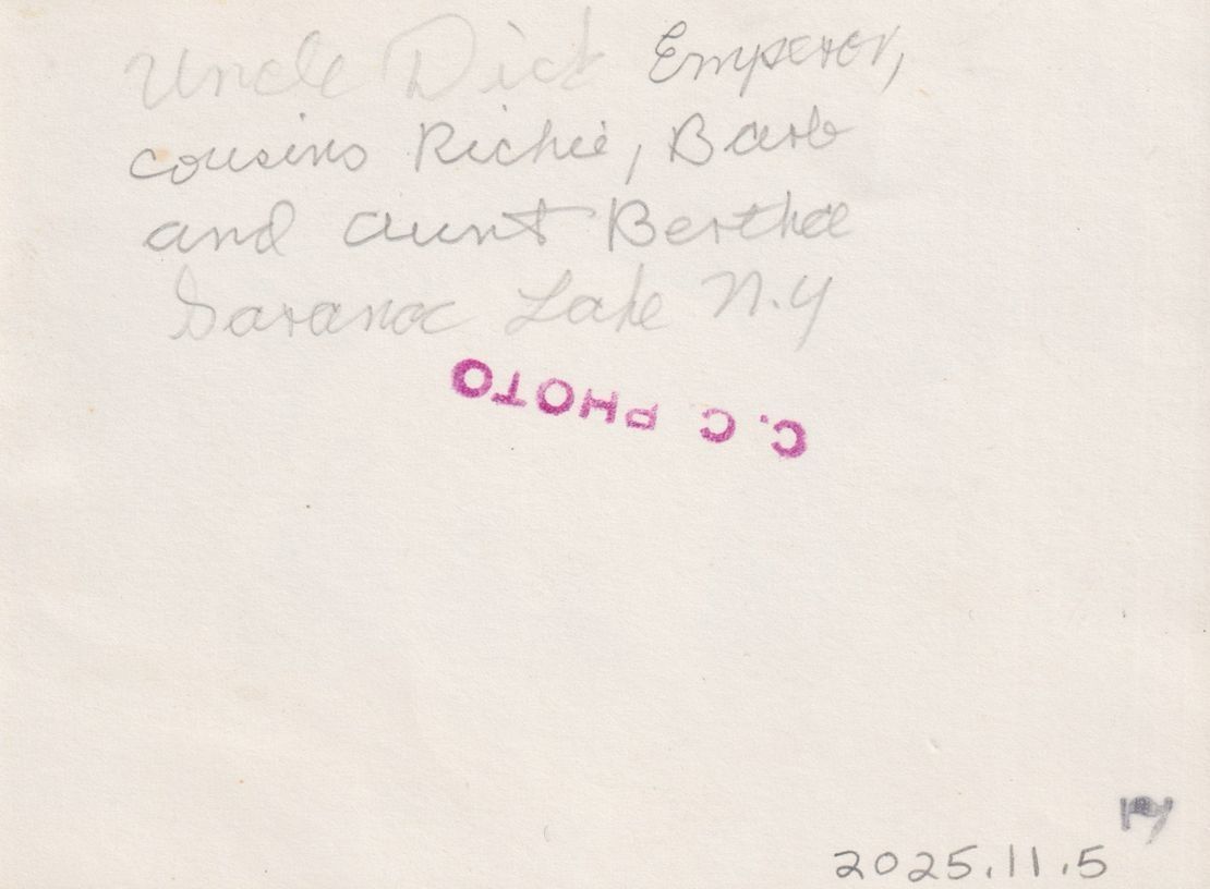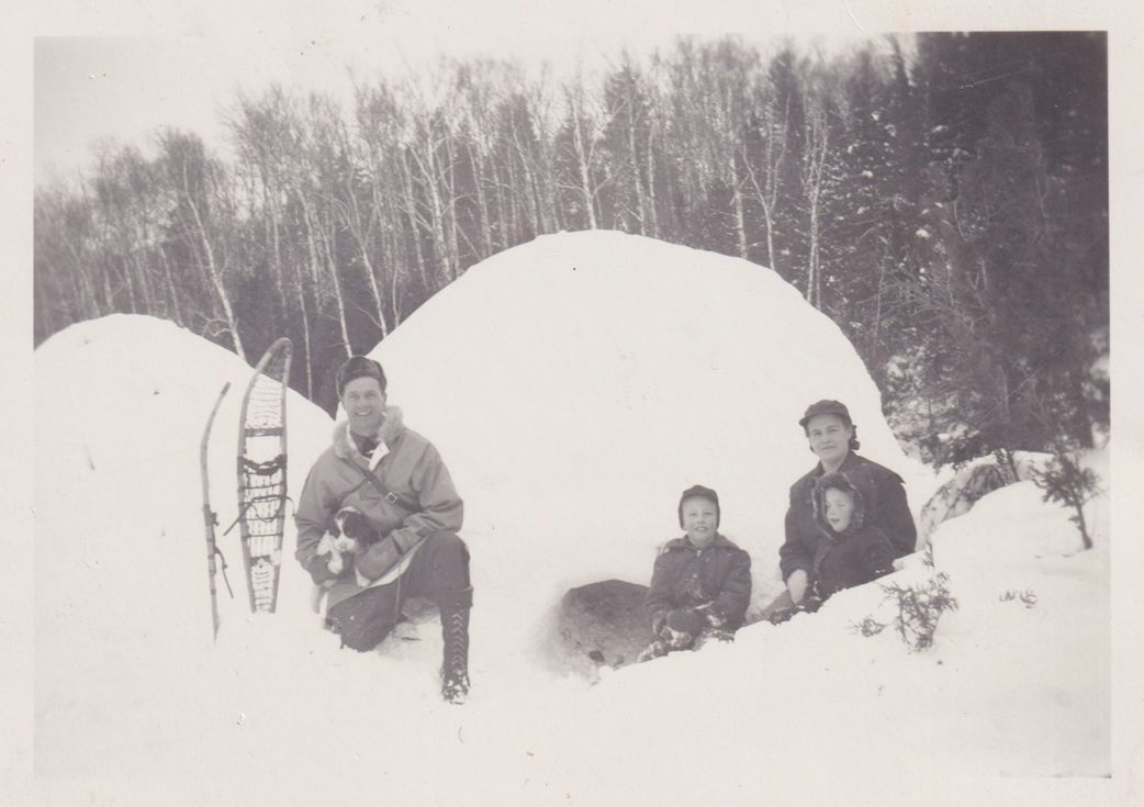 Black-and-White photograph of the Emperor Family in the snow in front of an igloo. Pictured are Dick and Bertha Emperor, and their children Richard and Barbara. There are snowshoes standing up in the snow next to Dick, and he is holding a puppy. Handwritten note on reverse reads, "Uncle Dick Emperor, cousins Richie, Barb, and Aunt Bertha, Saranac Lake, N. Y." Stamped with "C. C. Photo" on reverse.Photograph Details