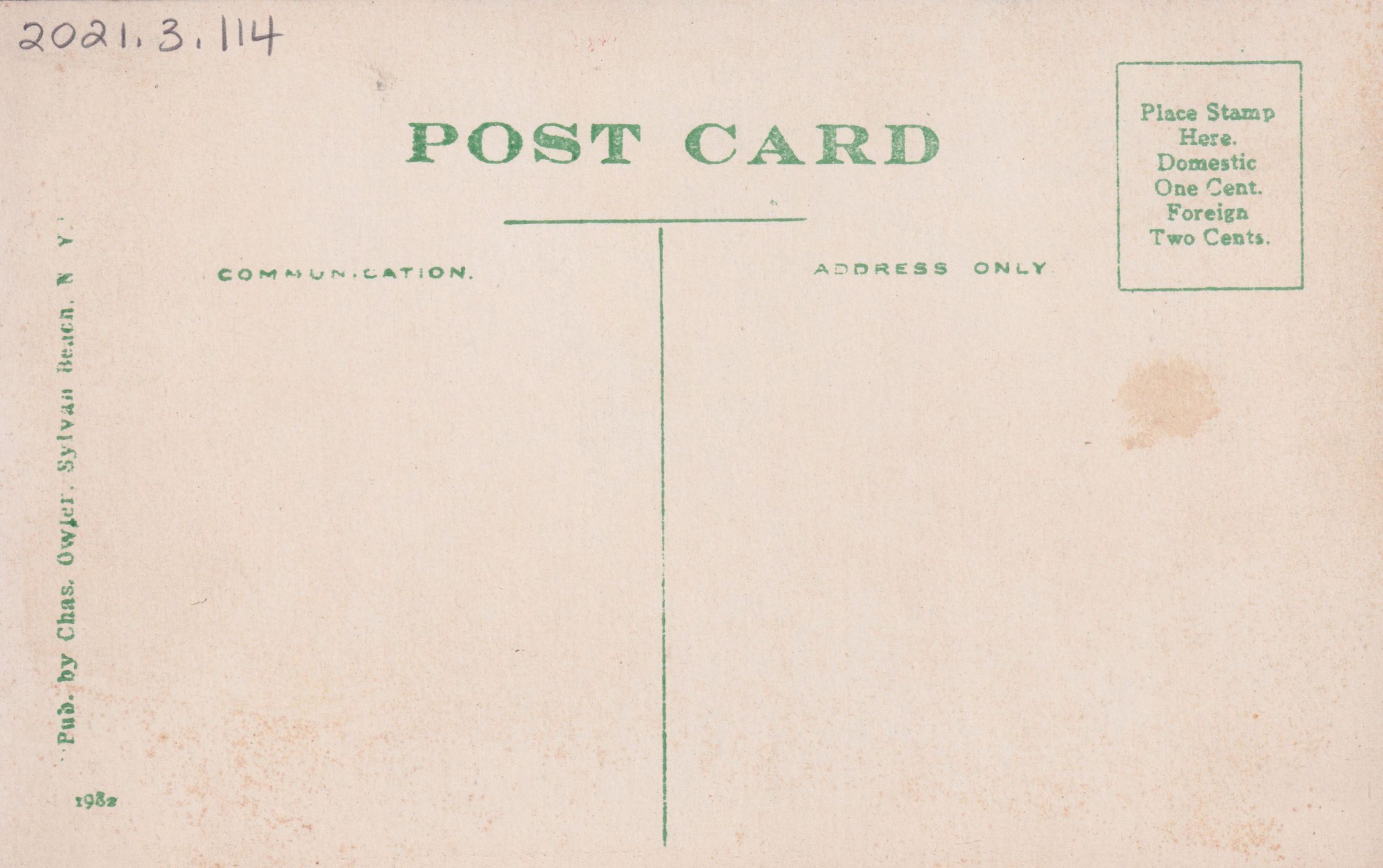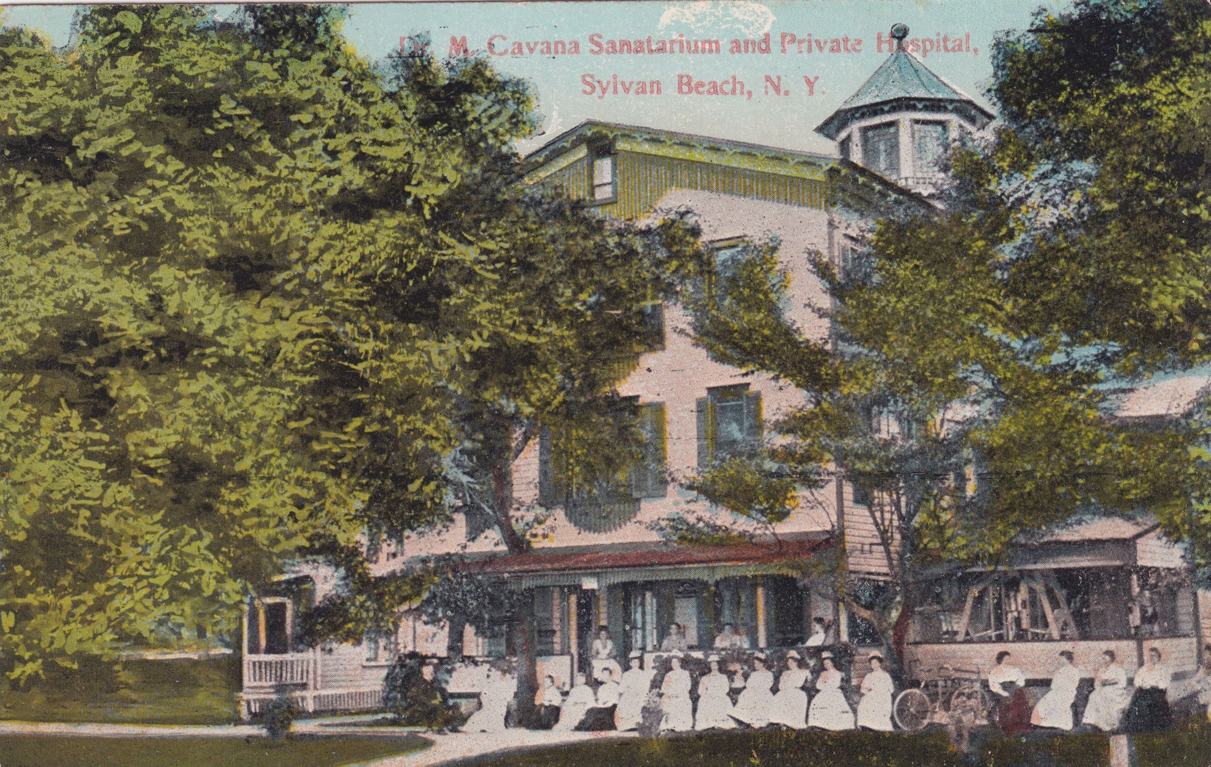 Color postcard showing nurses and patients seated outside a building. Printed caption on the front reads, "Dr. M. Cavana Sanatarium and Private Hospital, Sylvan Beach, N. Y." Unused, divided back. Printed by Chas. Owler, Sylvan Beach, NY.Collection