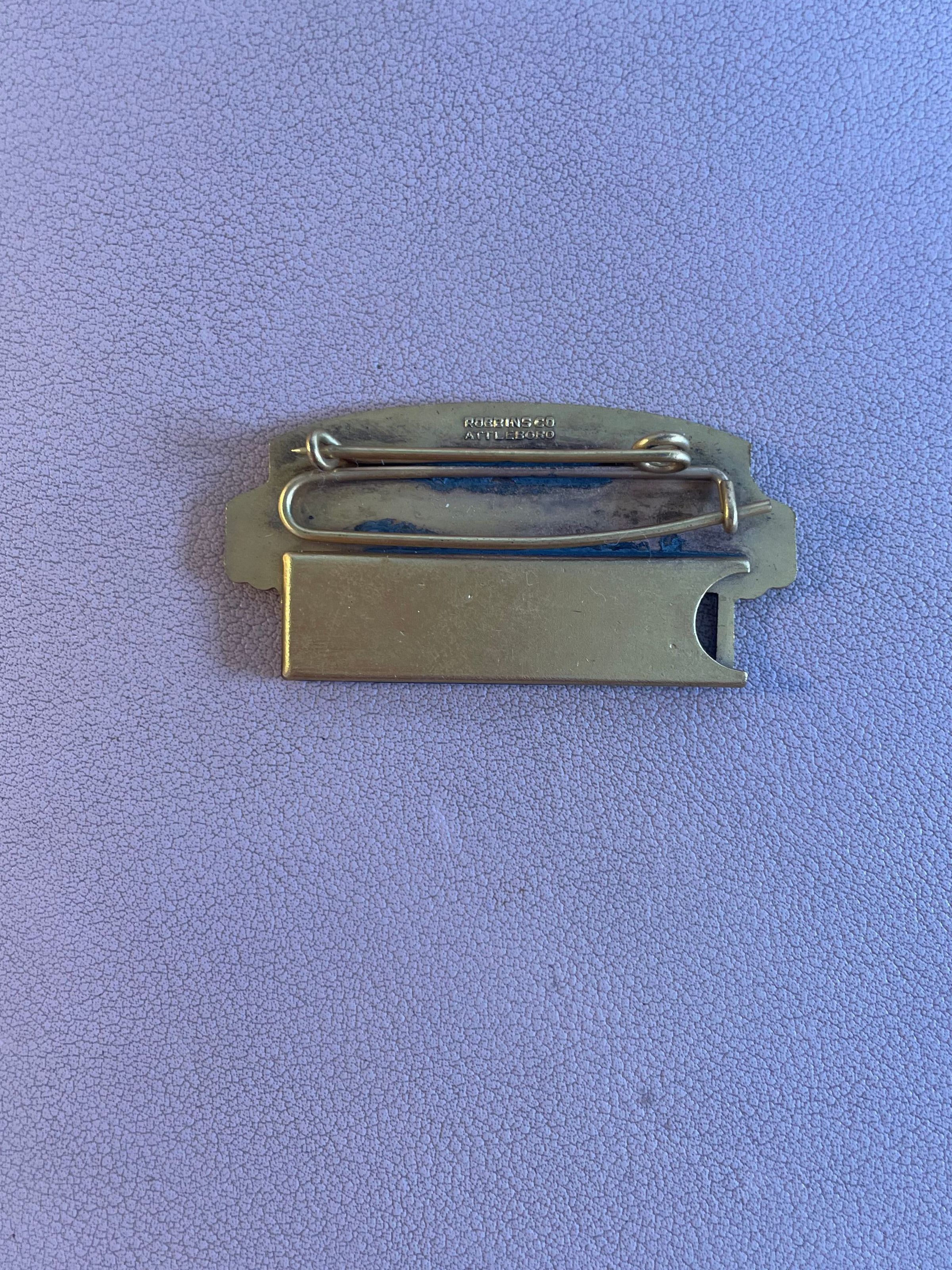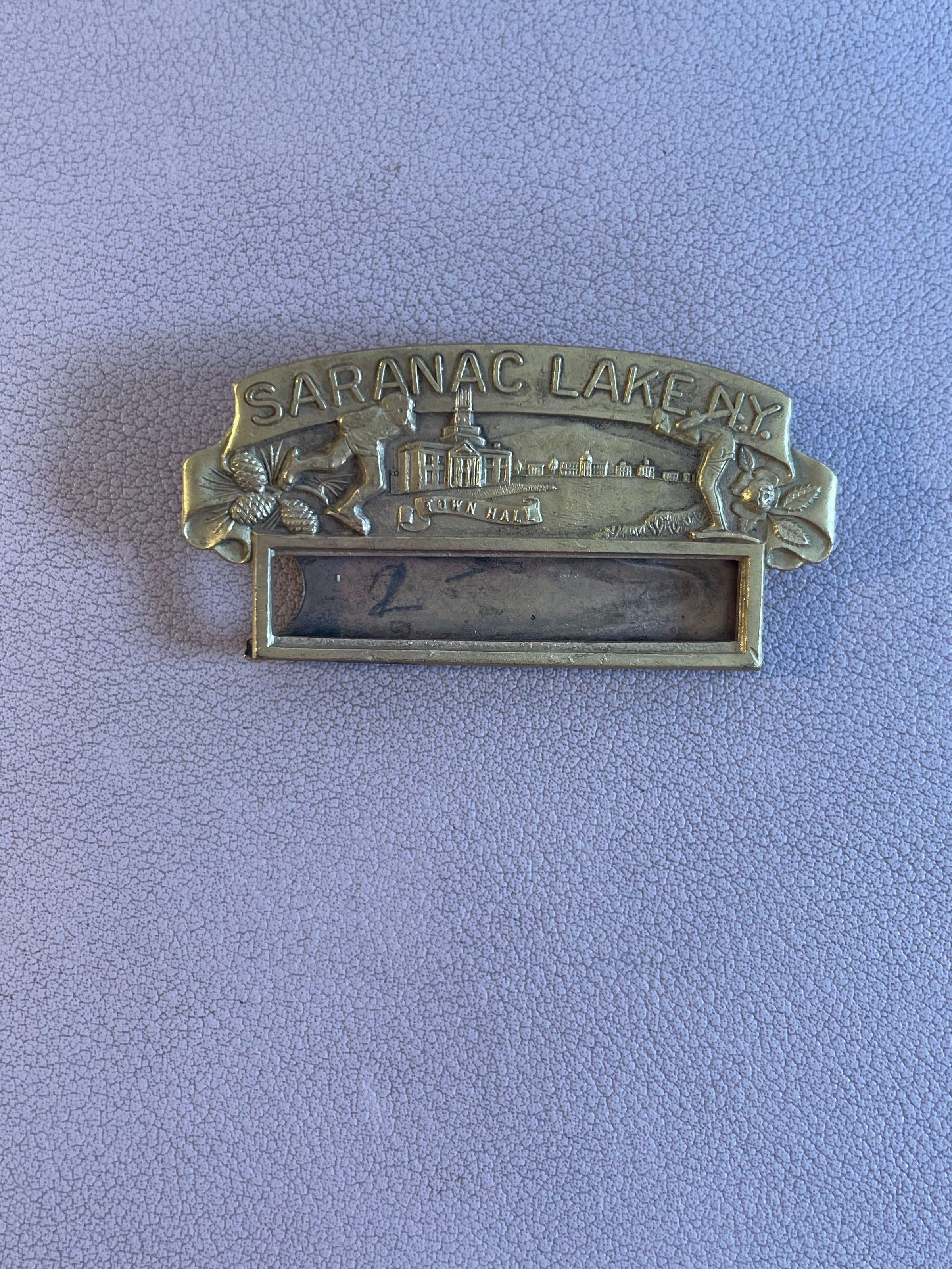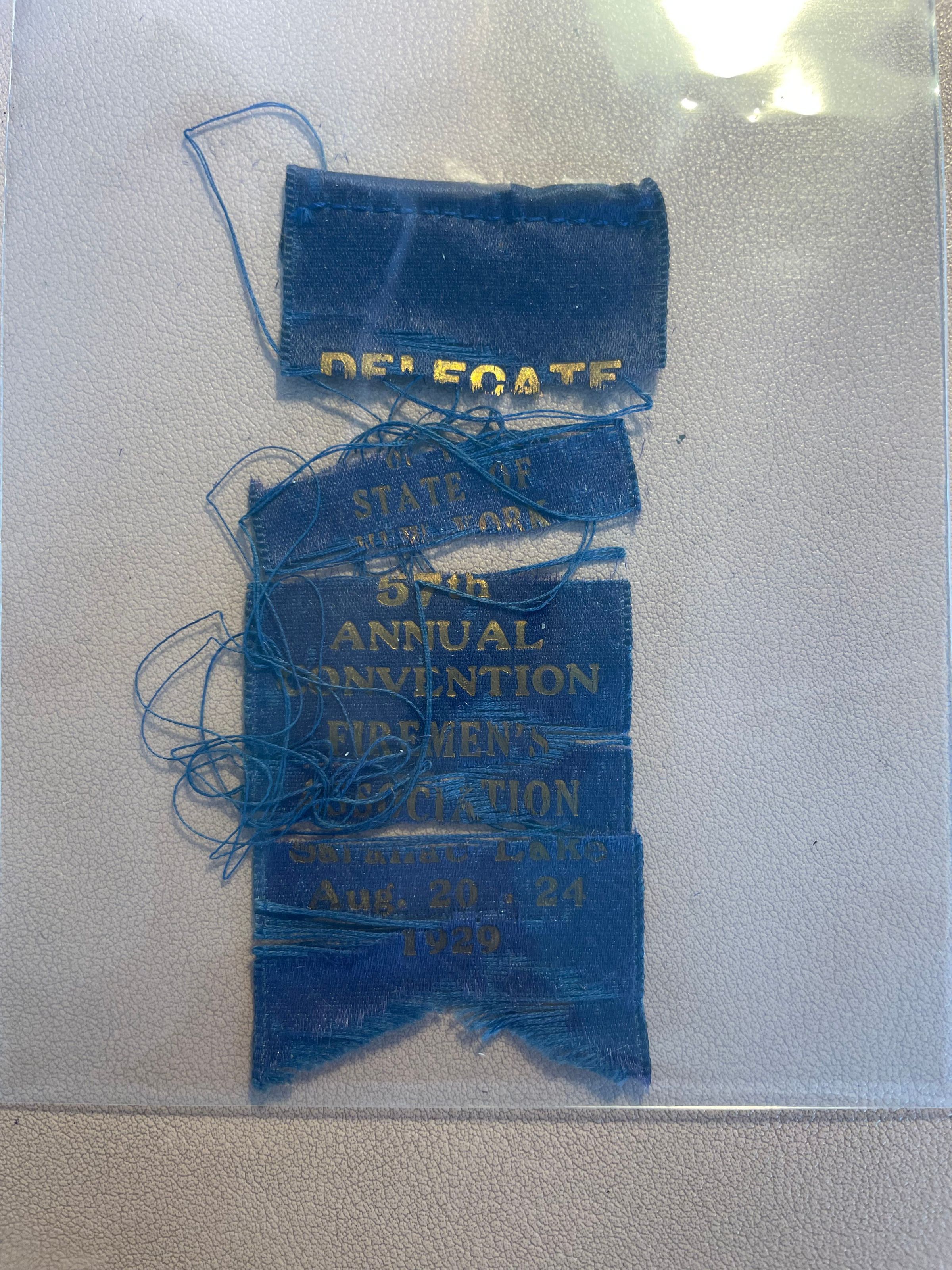 Souvenir nametag from the State of New York Firemen's Association 57th Annual Convention in Saranac Lake, August 20-24, 1929. Has gold nametag holder with pin back, and blue ribbon attached to bottom. Gold nametag reads, "Saranac Lake, N.Y.," and has images of pine cones, a speed skater, a diver, and Harrietstown Town Hall. Blue ribbon reads, "Delegate, of the State of New York 57th Annual Convention, Firemen's Association. Saranac Lake, Aug. 20 - 24, 1929," in gold ink. Ribbon is in extremely deteriorated condition.Collection