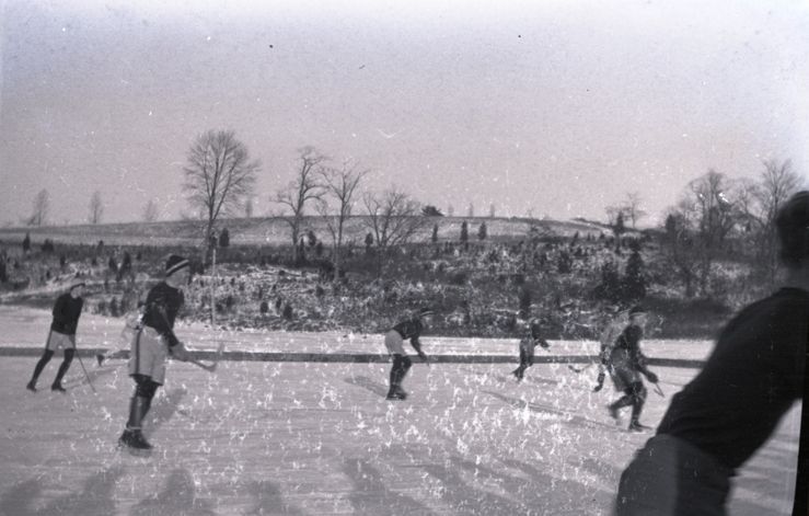 Negative of a group of young boys playing hockey on an outdoor ice rink. Most likely taken by Mary Ives Baldwin. This item is not fully cataloged but has been uploaded so the image is publicly available; if you would like us to prioritize cataloging this item, please contact the HSL Collections team.