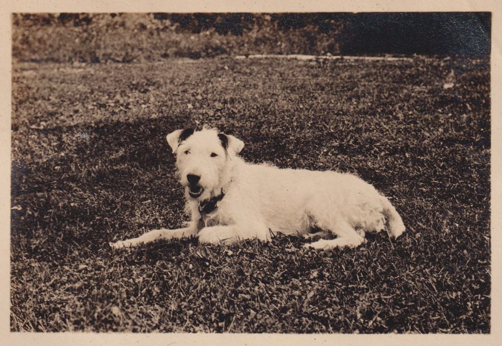 Black-and-White photograph of Peggy, the Jones Family’s dog. She is laying down in the grass. Part of album 2024.21.1, kept by Amy Jones and David Blair Jones c. 1930-1934.
