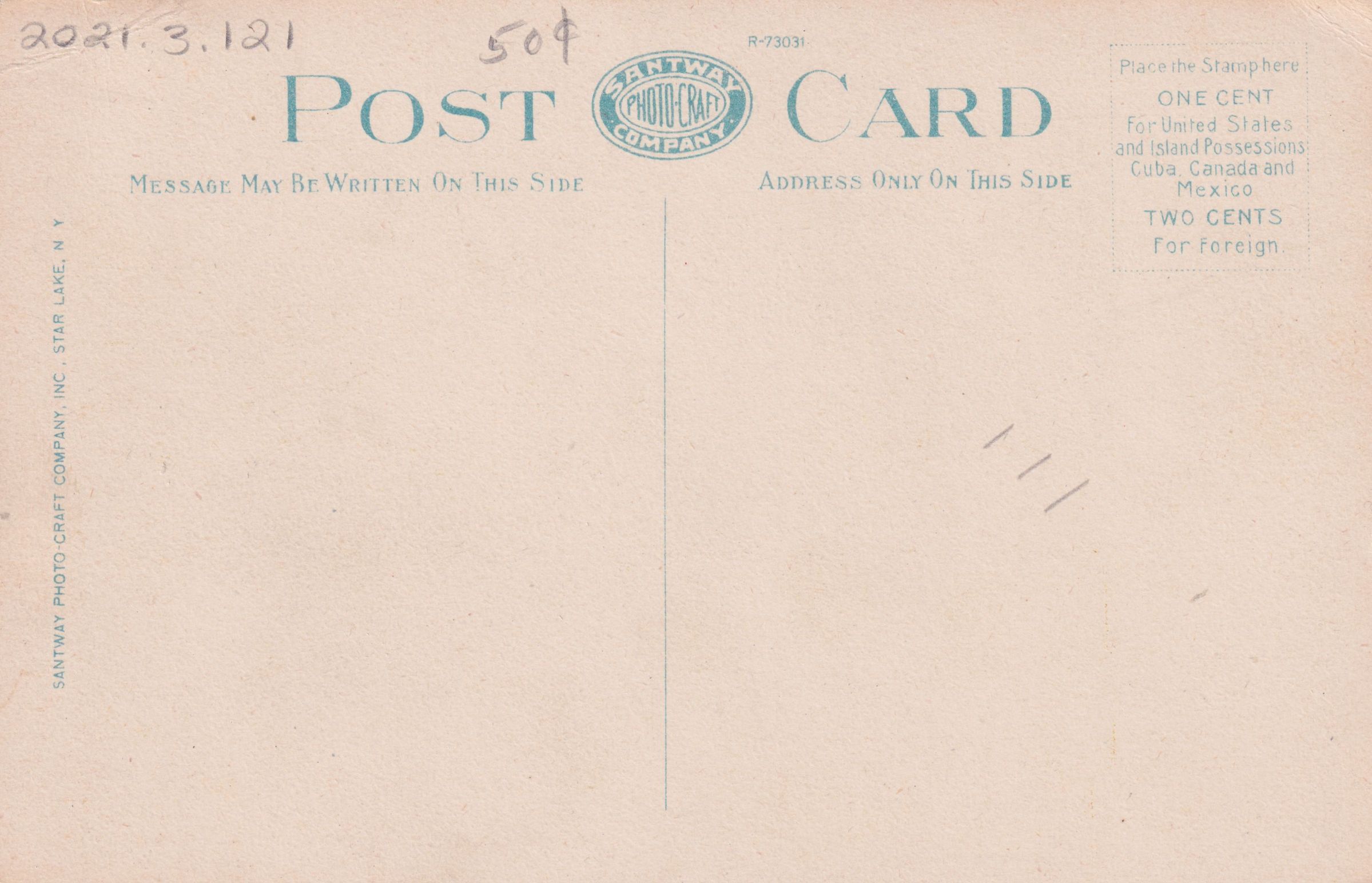 Color postcard showing a tree-covered hillside, likely Mt. Baker. Printed caption on front reads, "View from Trudeau Sanitarium, Near Saranac Lake, N. Y." Unused, divided back, white border. Printed by Santway Photo-Craft Company, Inc., Star Lake, NY.Subject Place