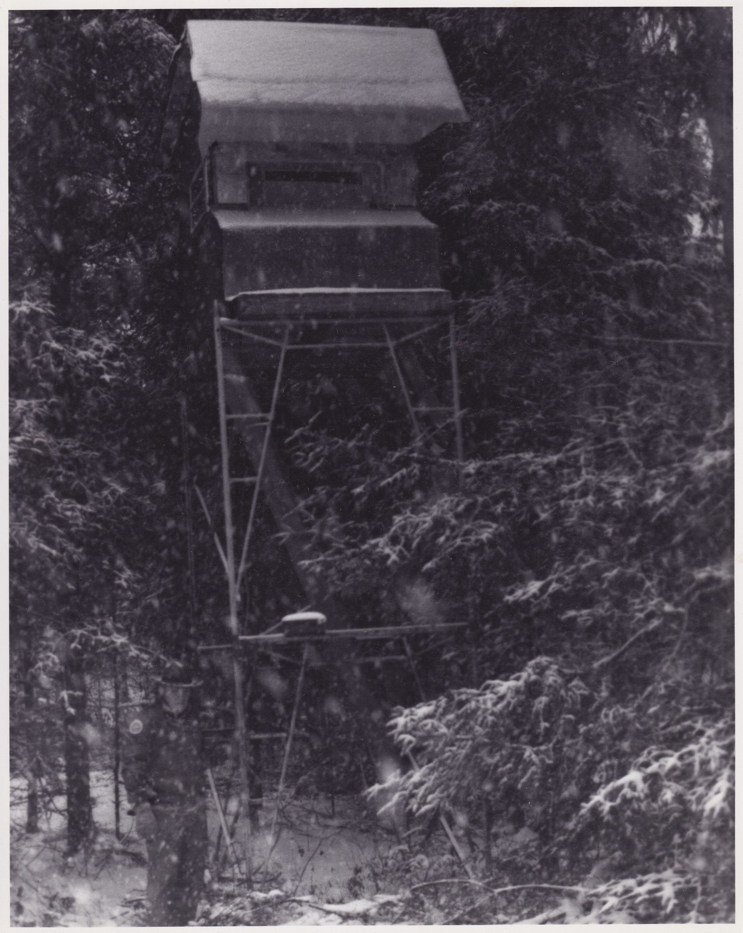 Black-and-White photograph of a hunting blind in the snow. Handwritten note on back reads, "#4 11/17/83. F5.6 Ap, 1/25 shutter speed, 12:58 PM, facing south."
