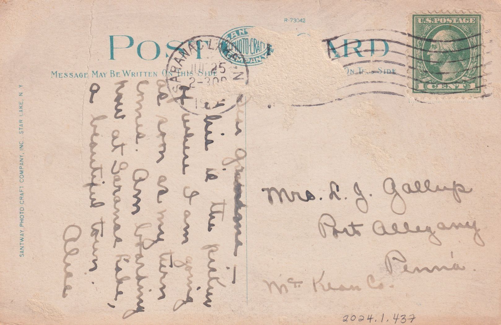 Handwritten message on reverse reads, "Dear Grandma, This is the picture of where I am going as soon as my turn comes. Am boarding now at Saranac Lake, a beautiful town. Alice." Mailed to Mrs. L. J. Gallup, Port Allegany, Penna, McKean Co.Subject Place