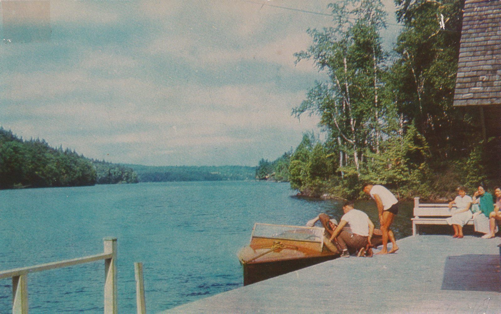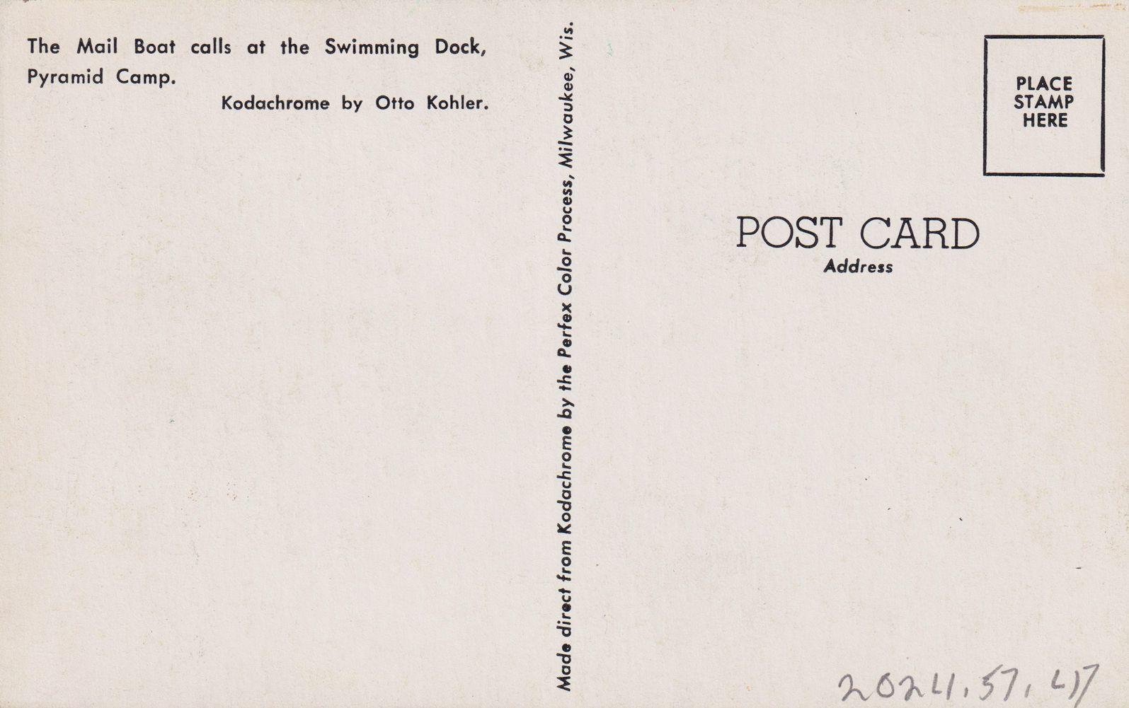 Color postcard showing two men leaning over a boat pulled up to dock at Pyramid Camp (AKA Bartlett Carry Club). Printed caption on reverse reads, "The Mail Boat calls at the Swimming Dock, Pyramid Camp." Photochrome by Otto Kohler. Printed by the Perfex Color Process, Milwaukee. Unused, divided back.Subject Place