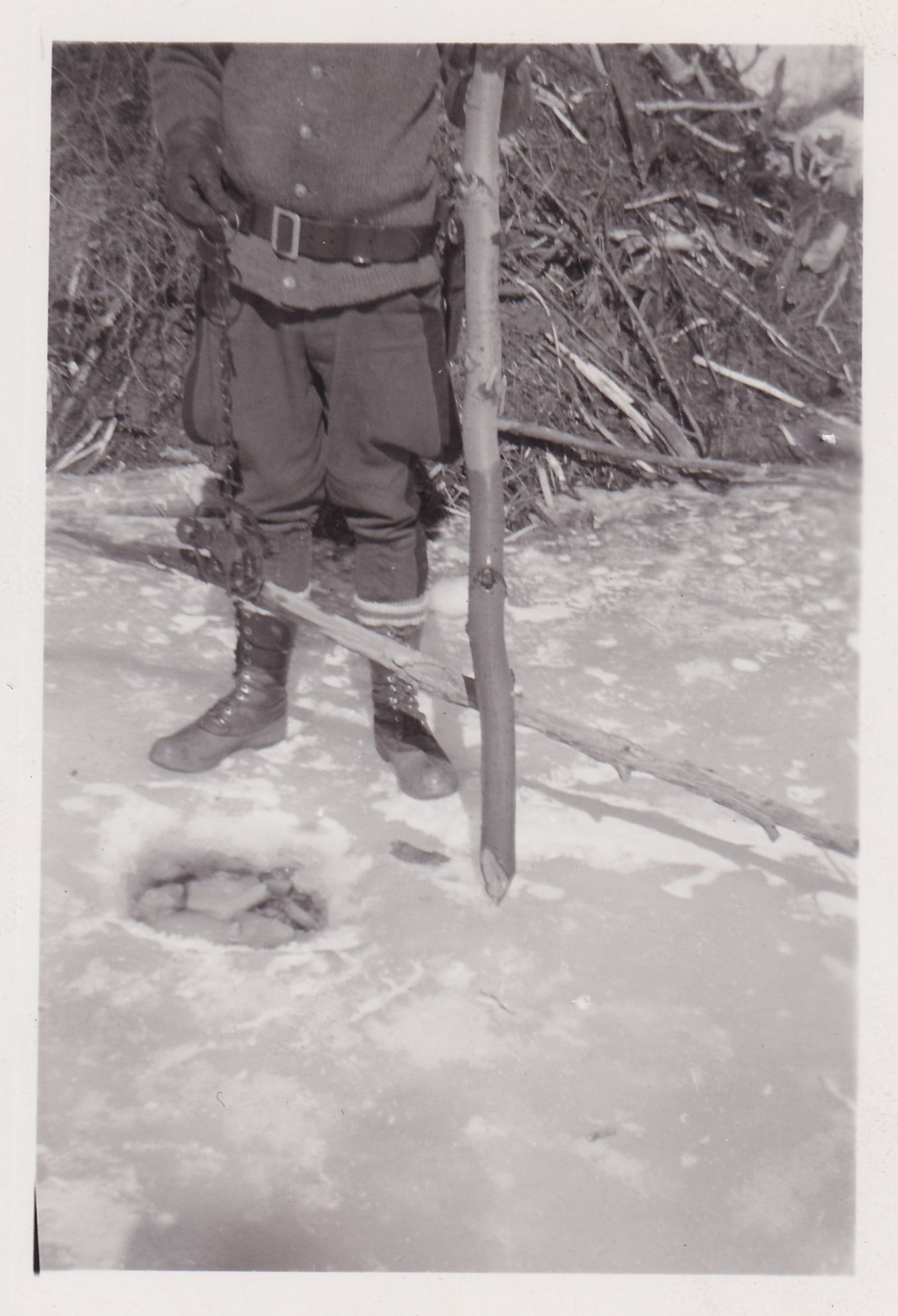 Black-and-White photograph showing a beaver trap next to a hole in the ice. A pair of feet and the base of a beaver dam can be seen in the background.
