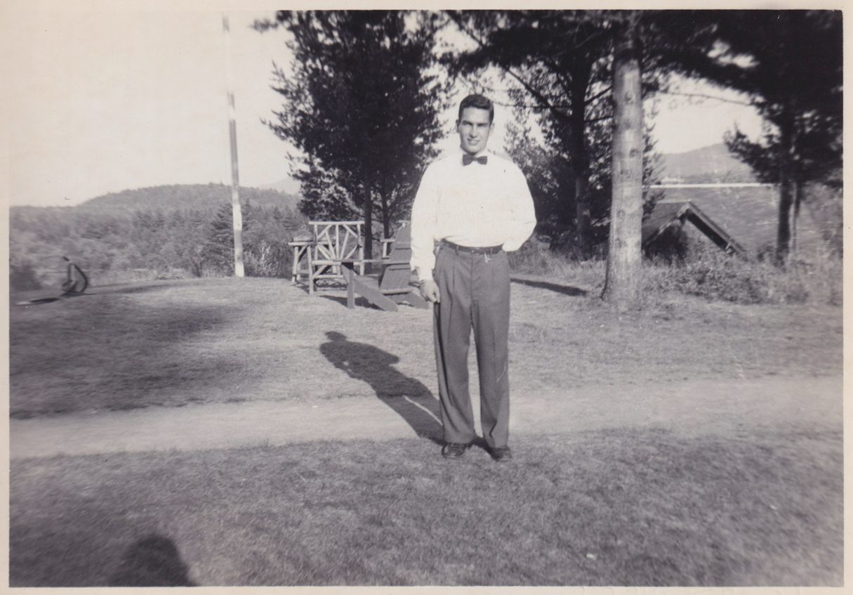 Black-and-White photograph of a man standing outdoors at Pyramid Camp, (AKA the Bartlett Carry Club). He is wearing a dress shirt and bow tie. Handwritten note on reverse reads, "1952." A note in pencil in a different handwriting is illegible.