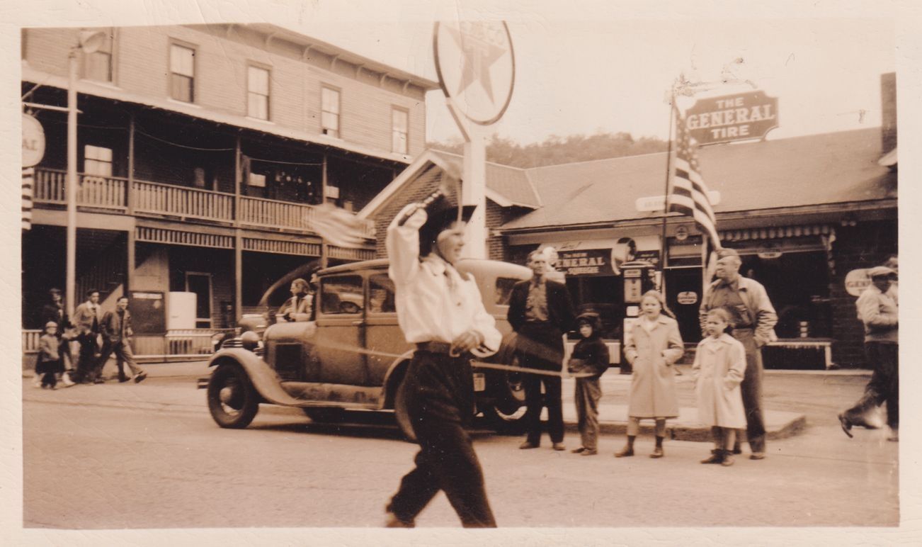Black and white photograph of a person in jeans and a cowboy hat twirling a lasso above their head. There are people watching from the side of the road, suggesting the person is part of a parade. The General Tire can be seen in the background of the photo. This item is not fully cataloged but has been uploaded so the image is publicly available; if you would like us to prioritize cataloging this item, please contact the HSL Collections team.