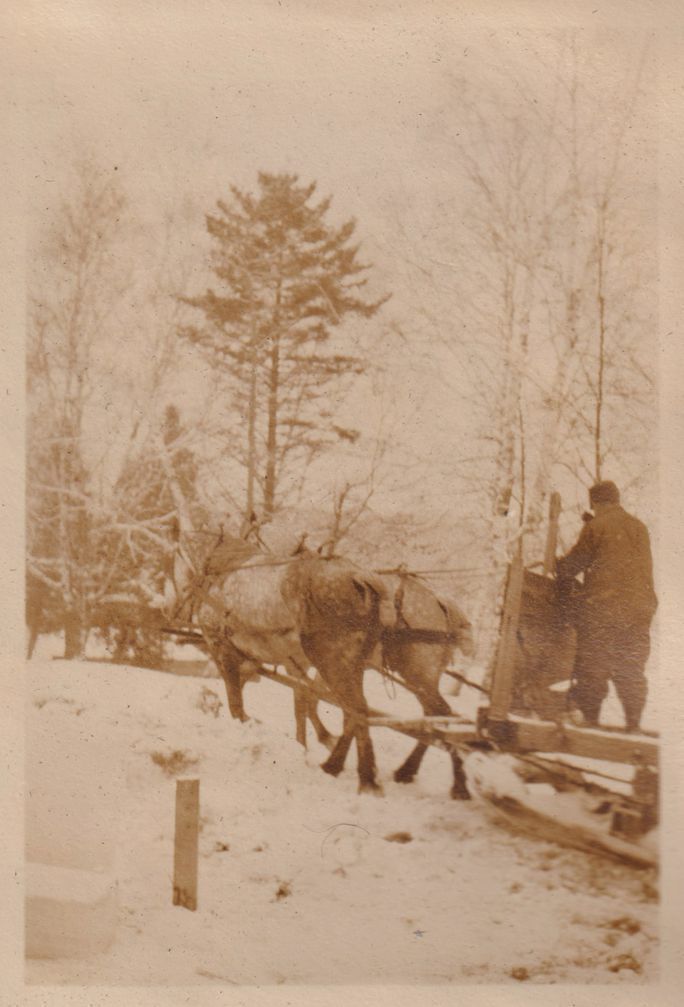 Black-and-White photograph of a horse-drawn ice sledge on Ampersand Bay. Part of album 2024.21.1, kept by Amy Jones and David Blair Jones c. 1930-1934.