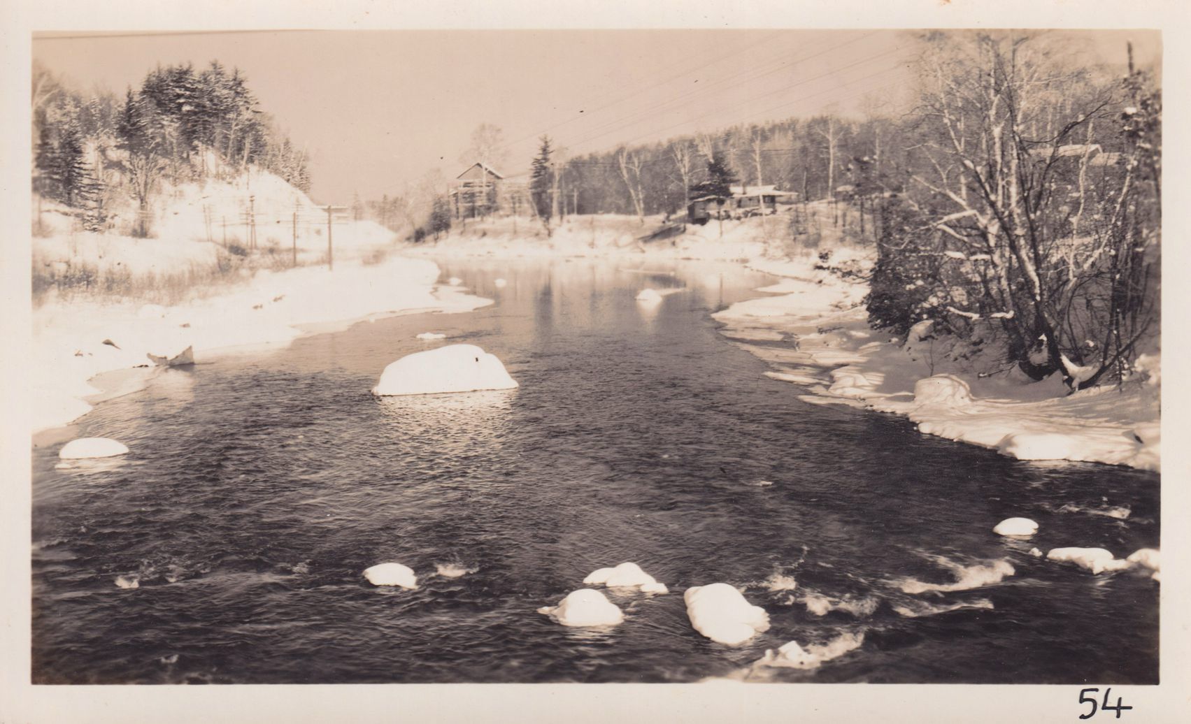 Black-and-White photograph of an unidentified snowy river. "54" is handwritten on the bottom right corner. The photograph was likely printed by Kollecker's Kodak and Gift Shop.