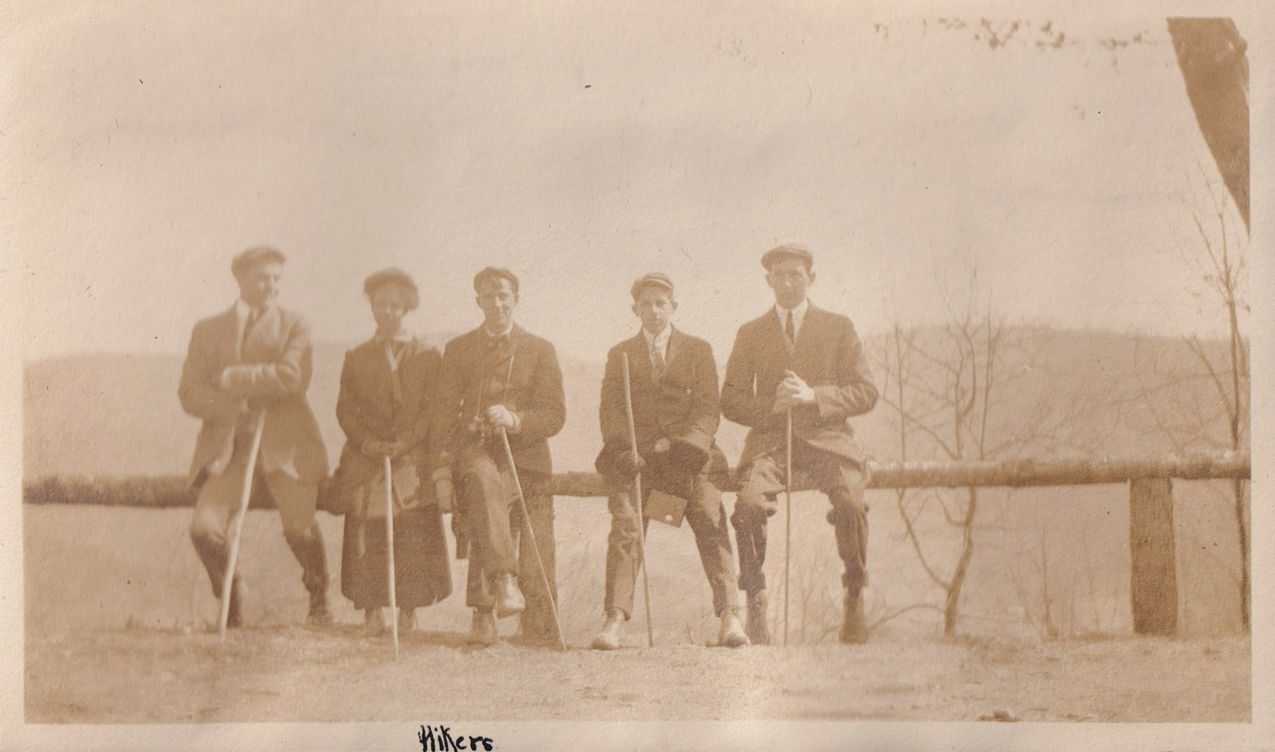 Black-and-white photograph of four men and one woman, all with walking sticks and sitting on a wooden fence next to the edge of a path. There appears to be a decline or valley behind the fence. "Hikers" is written in ink beneath the photograph.