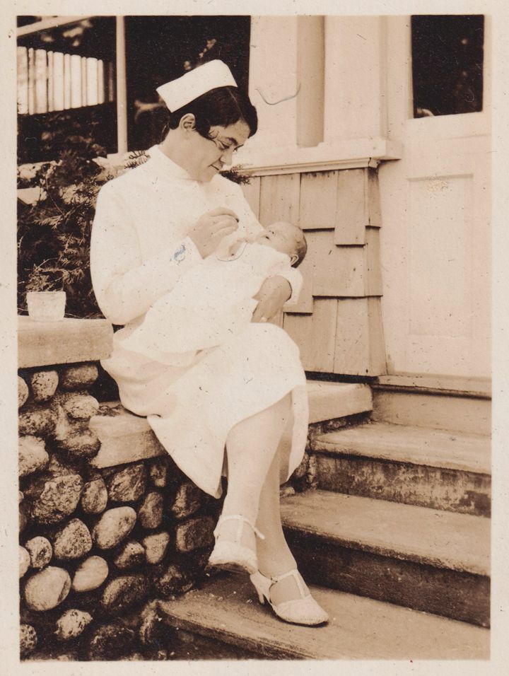 Black-and-White photograph of a nurse, nicknamed “Blackie,” cradling a newborn Lucy Jones. She is seated on the steps of the Jones’ second home in Saranac Lake on Lake Street, possibly 453 Lake Street.