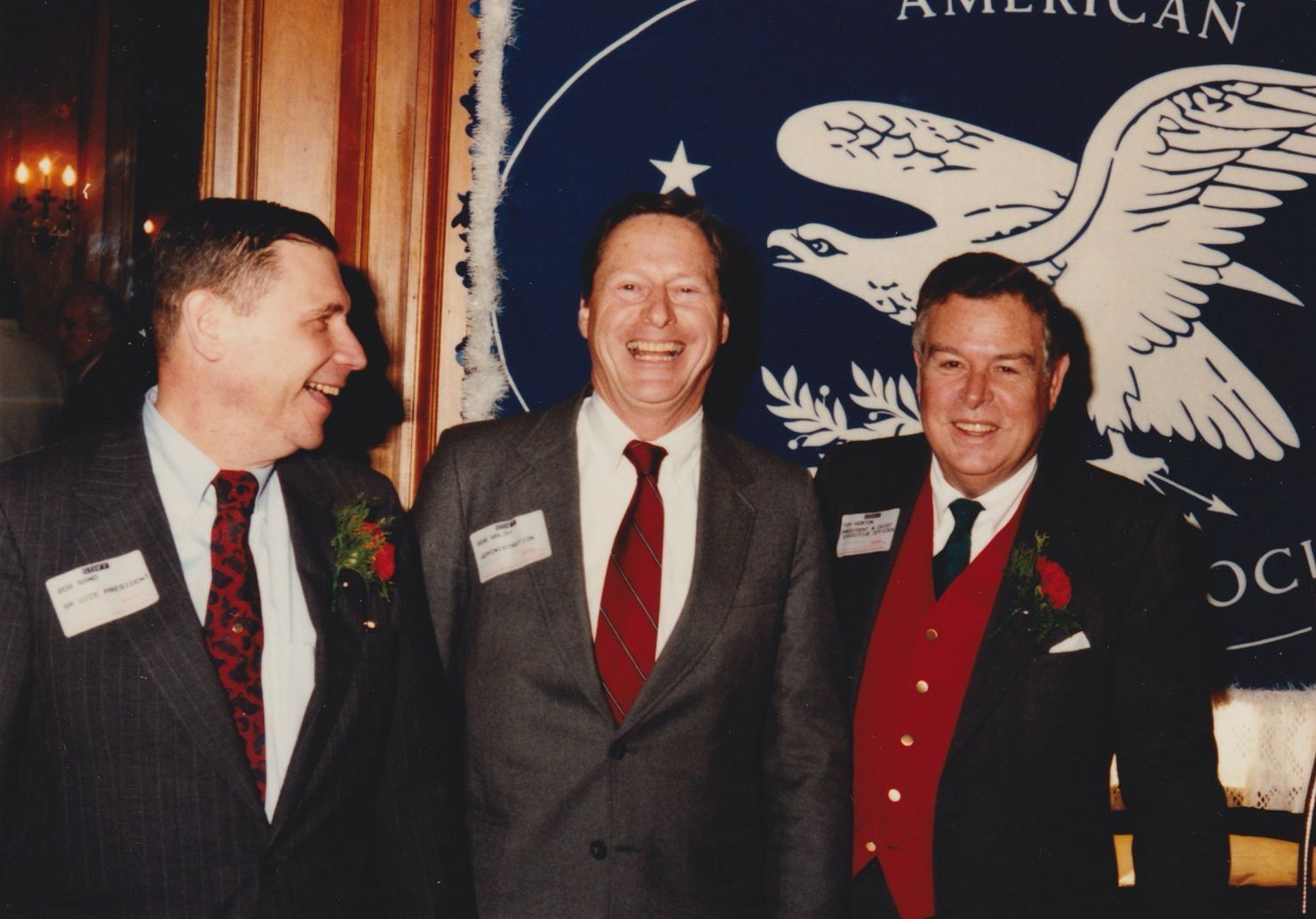 Color photograph of three men wearing suits standing together. They are standing in front of an American Management Association banner. Two of the men have flowers pinned to the front of their suits and all three have name tags. This photograph is from an album of photographs taken at the American Management Association.