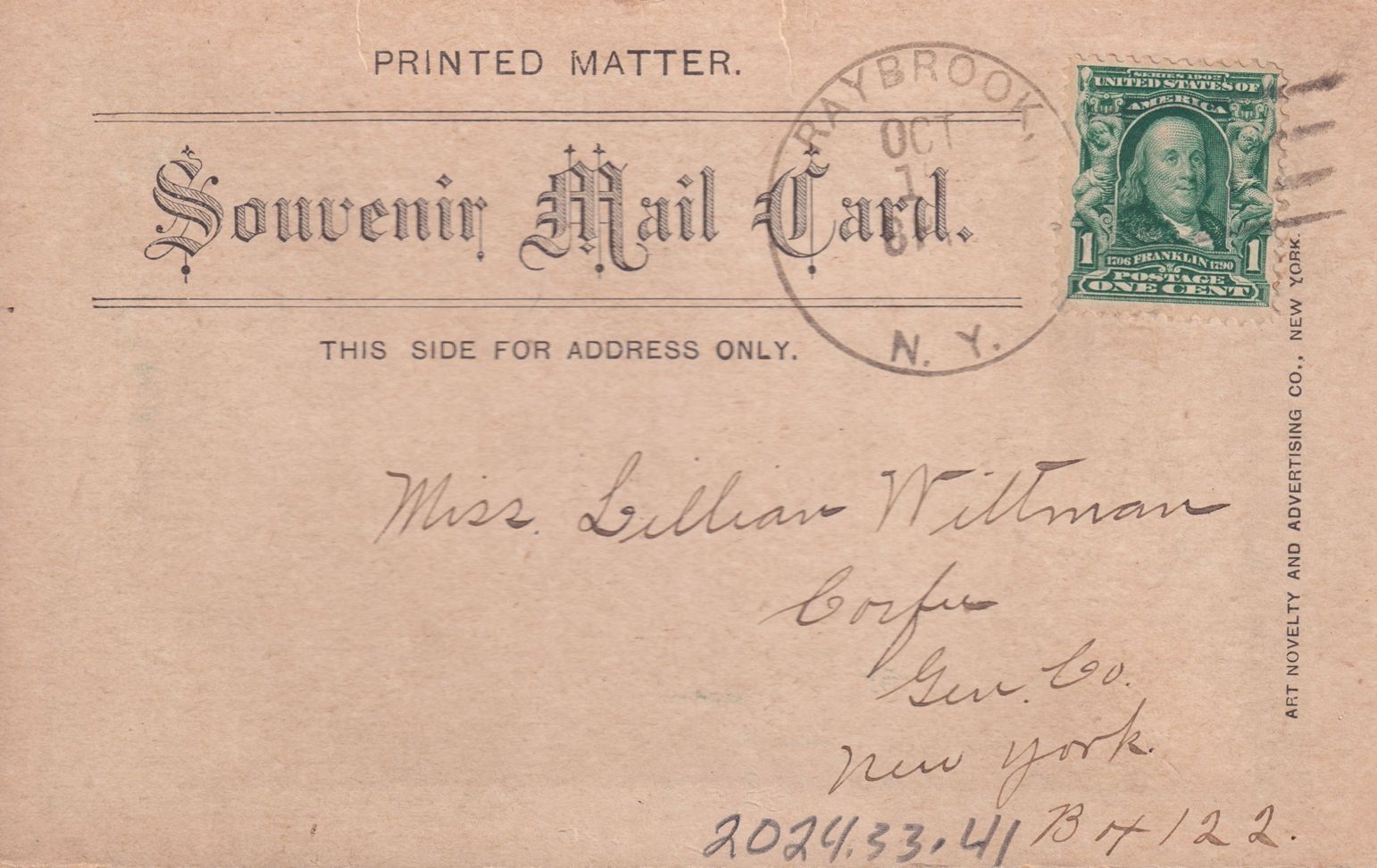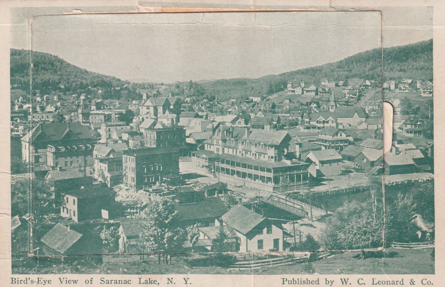 Postcard with a print of an aerial photograph of Saranac Lake, published by W. C. Leonard & Co. The postcard is addressed to Miss Lillian William.