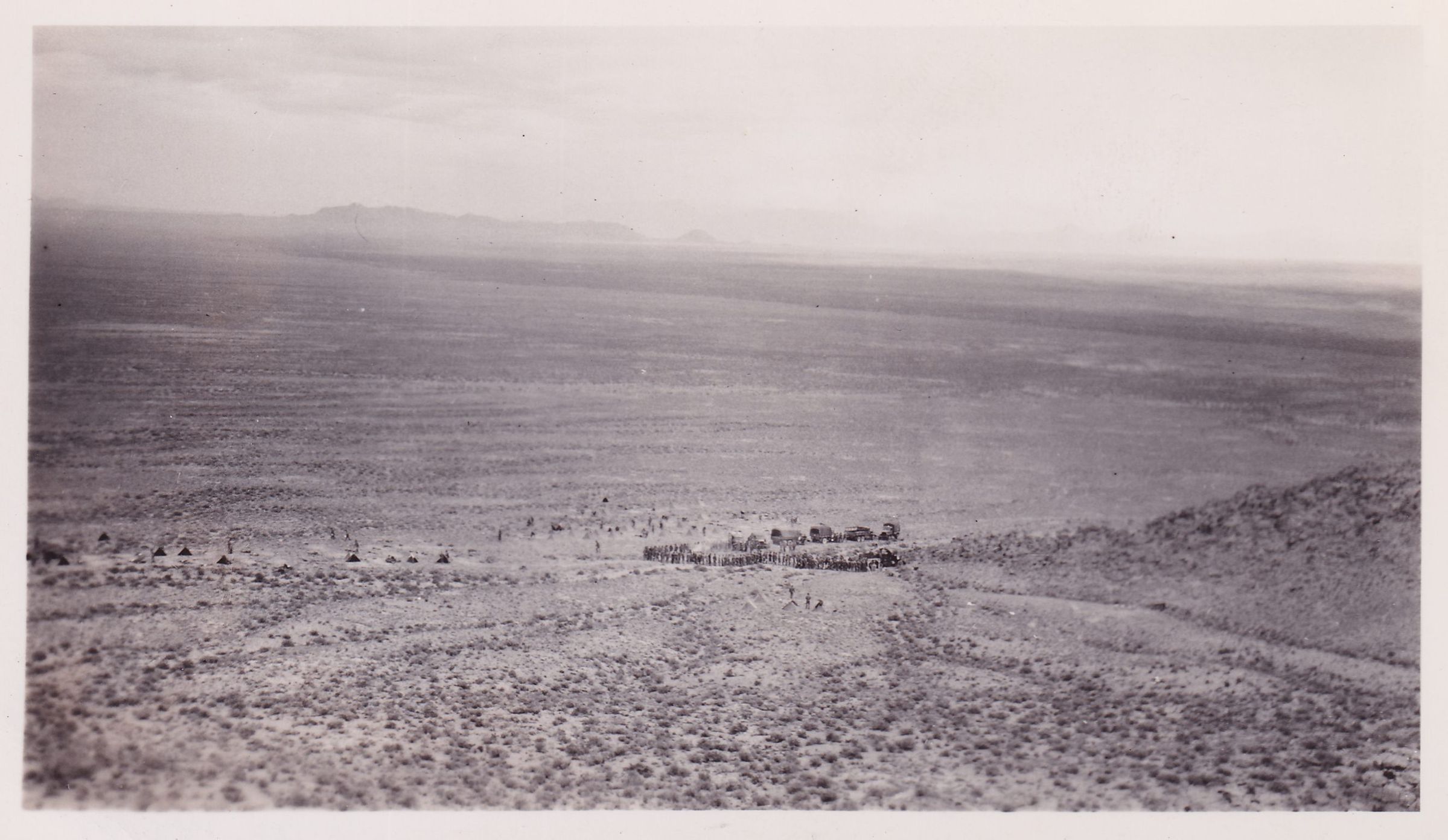 Black-and-White photograph looking down on soldiers in the desert at a distance. See 2022.144.91 for notes.