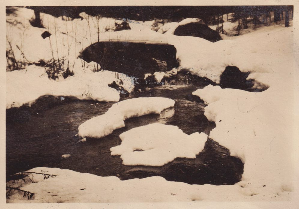Black-and-White photograph of a snowy brook, possibly flowing into Ampersand Bay.