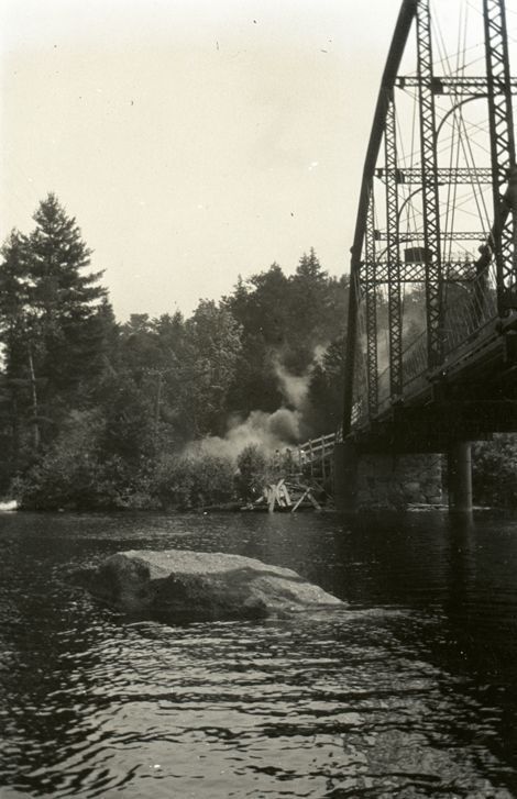 Negative of an iron railroad bridge spanning a river, taken from the shore. There is a forest on the other side of the river. Also there is smoke in the trees at the other side of the bridge, perhaps from an approaching train. Most likely taken by Mary Ives Baldwin. This item is not fully cataloged but has been uploaded so the image is publicly available; if you would like us to prioritize cataloging this item, please contact the HSL Collections team.