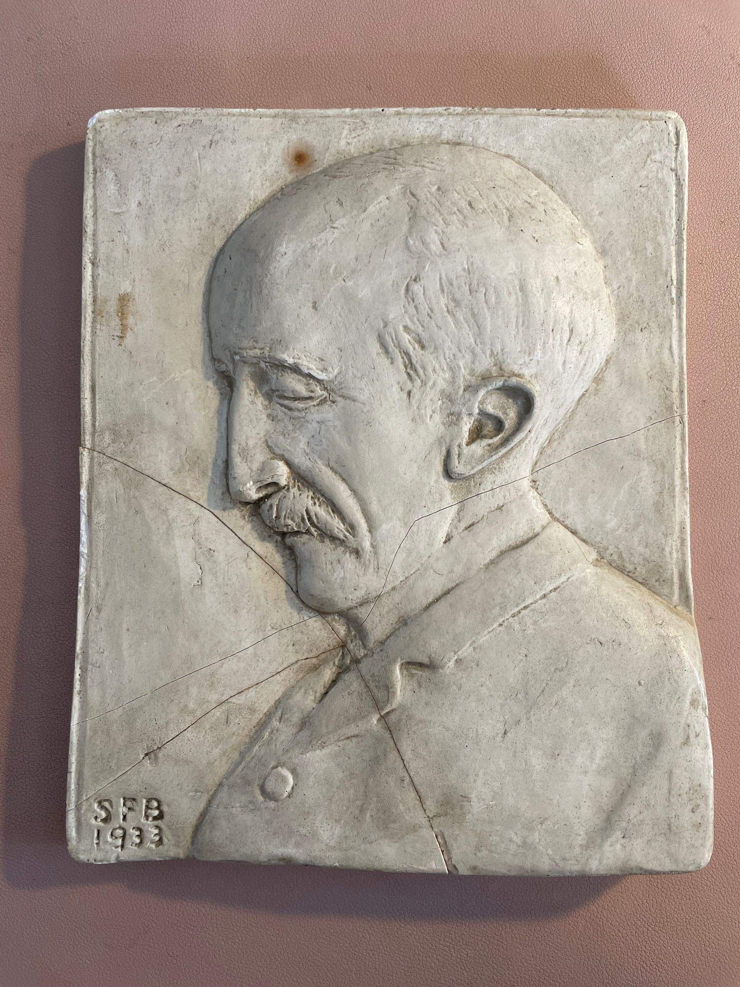 Plaster bas-relief showing Dr. Edward Livingston Trudeau in left profile. He is depicted wearing a suit or lab coat with his eyes closed. The sculpture is signed at bottom left "SFB 1933." Back and sides have no markings. Wire loop at top for hanging, has been painted or stained a light grey/tan color. The relief is cracked across in several places.