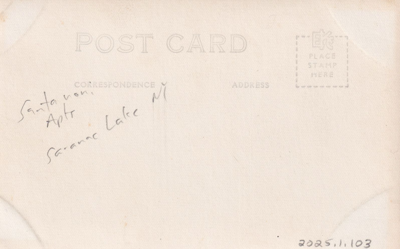 Black-and-White photograph postcard showing the south and west sides of the Santanoni Apartments, prior to the fire in 1973. No photographer's mark. Unused, divided back, white border.Subject Place