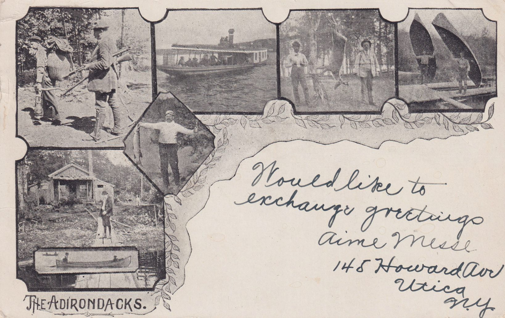 Postcard with multiple pictures printed on it, including: A hunter and guide, a steamer ship, hunters with a dead deer, two men holding boats, a man holding a fish, a man standing on a dock, and a man in a boat on the water. The postcard is addressed to Mrs. Gro Storay from Aime Messe.
