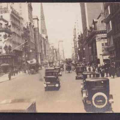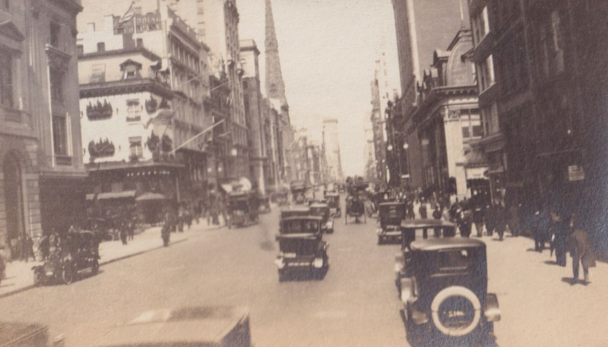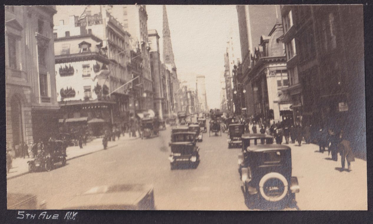 Black-and-white photograph of Fifth Avenue in New York City. There are many cars on the street and people walking on the sidewalks. "5th Ave N.Y." is written in white ink beneath the photograph.