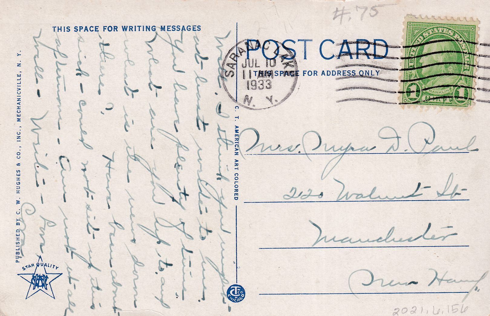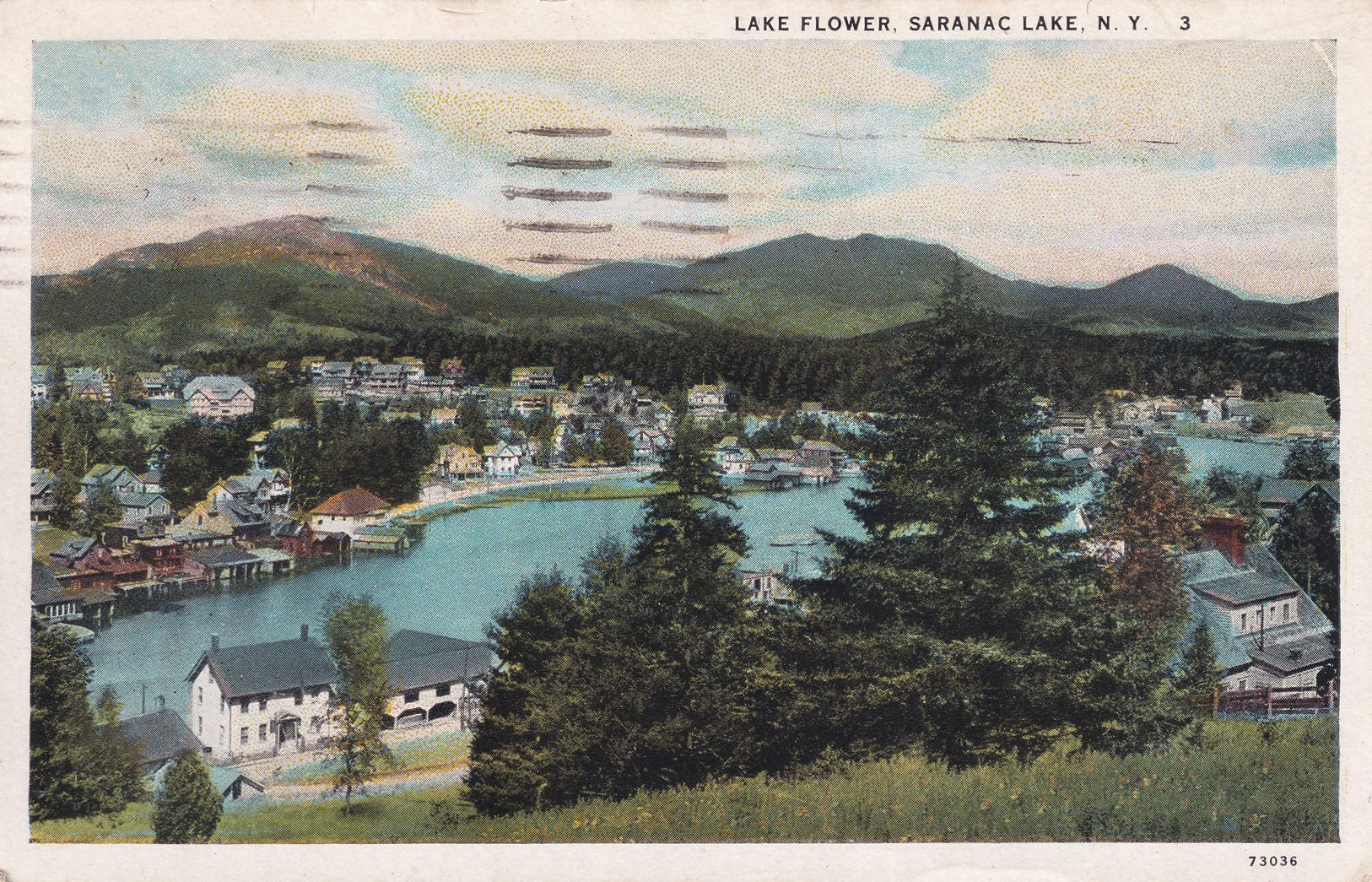 Color postcard showing a view of the village of Saranac Lake and Lake Flower from Blood Hill / Lake Street Hill, looking east. Buildings can be seen on both shores of the lake, as well as on Helen Hill and throughout the village. Mountains are visible in the background. Printed caption on front reads, "Lake Flower, Saranac Lake, N.Y." Used, divided back, white border, postmarked Saranac Lake, July 10 1933. Printed by C. W. Hughes & Co., Inc., Mechanicville, NY. Handwritten message on back reads, "Well, I think you might at least write to me. You have plenty of time. What are you up to and what is the news down there? Have been about[?] sick--could not sit up this afternoon. Am not at all well. Write. Love, Cora." Mailed to Mrs. Myra D. Paul, 220 Walnut St., Manchester, New Hamp.Subject Place