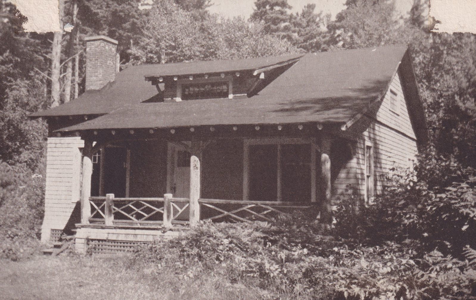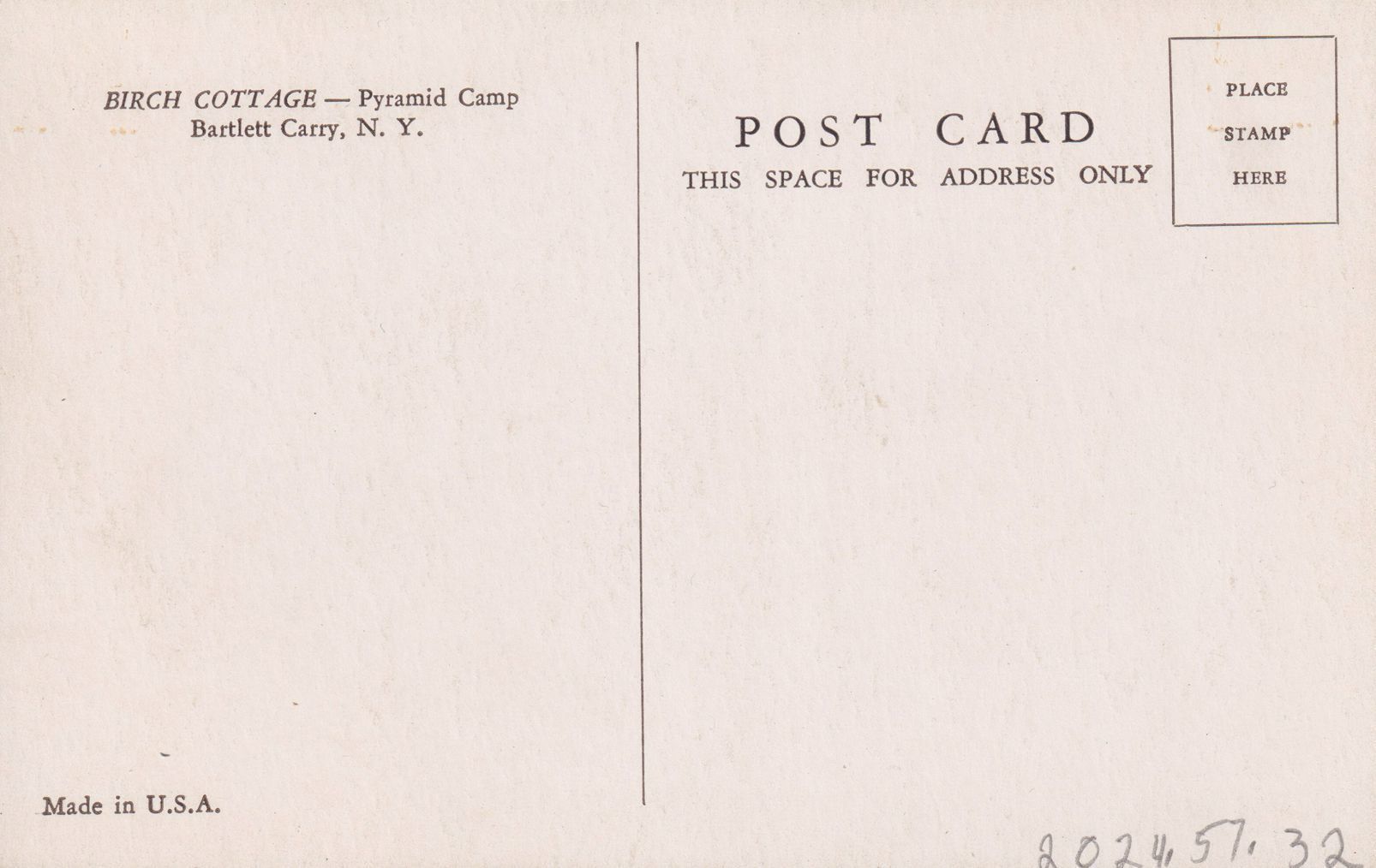Black-and-White postcard showing the Birch Cottage at Pyramid Camp (AKA Bartlett Carry Camp). No printer's mark. Unused, divided back.