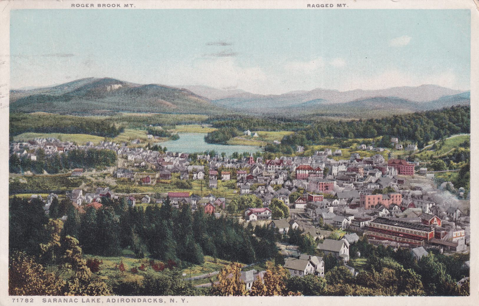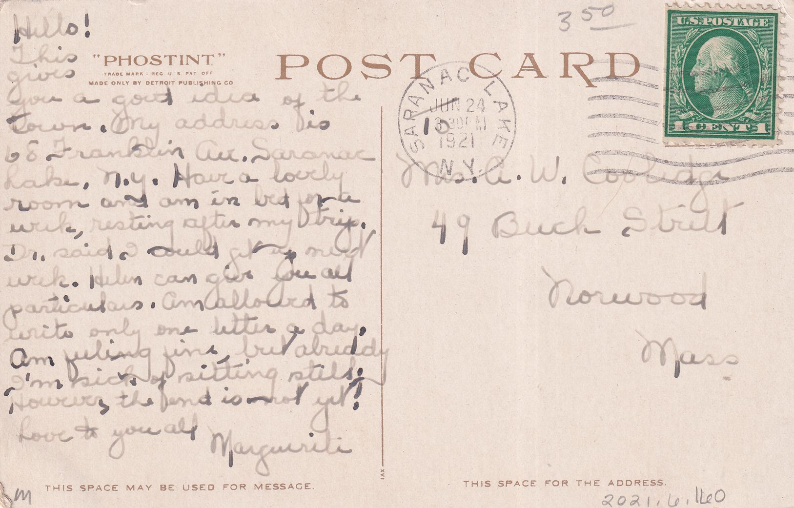 Color postcard showing the village of Saranac Lake from the side of Mt. Pisgah, looking south. Buildings throughout downtown and Helen Hill are visible. Two mountains in the background have printed labels above them, "Roger Brook Mt." and "Ragged Mt." Printed caption on front reads, "Saranac Lake, Adirondacks, N. Y." Used, divided back, white border, postmarked Saranac Lake, June 24, 1921. Handwritten message on back reads, "Hello! This gives you a good idea of the town. My address is 68 Franklin Ave. Saranac Lake, N.Y. Have a lovely room and am in bed for a week, resting after my trip. Dr. Said I could get up next week. Helen can give you all particulars. Am allowed to write only one letter a day. Am feeling fine but already I'm sick of sitting still. However, the end is not yet! Love to you all, Marguerite." Mailed to Mrs. A. W. Coolidge, 49 Buck Street, Norwood, Mass.Subject Place
