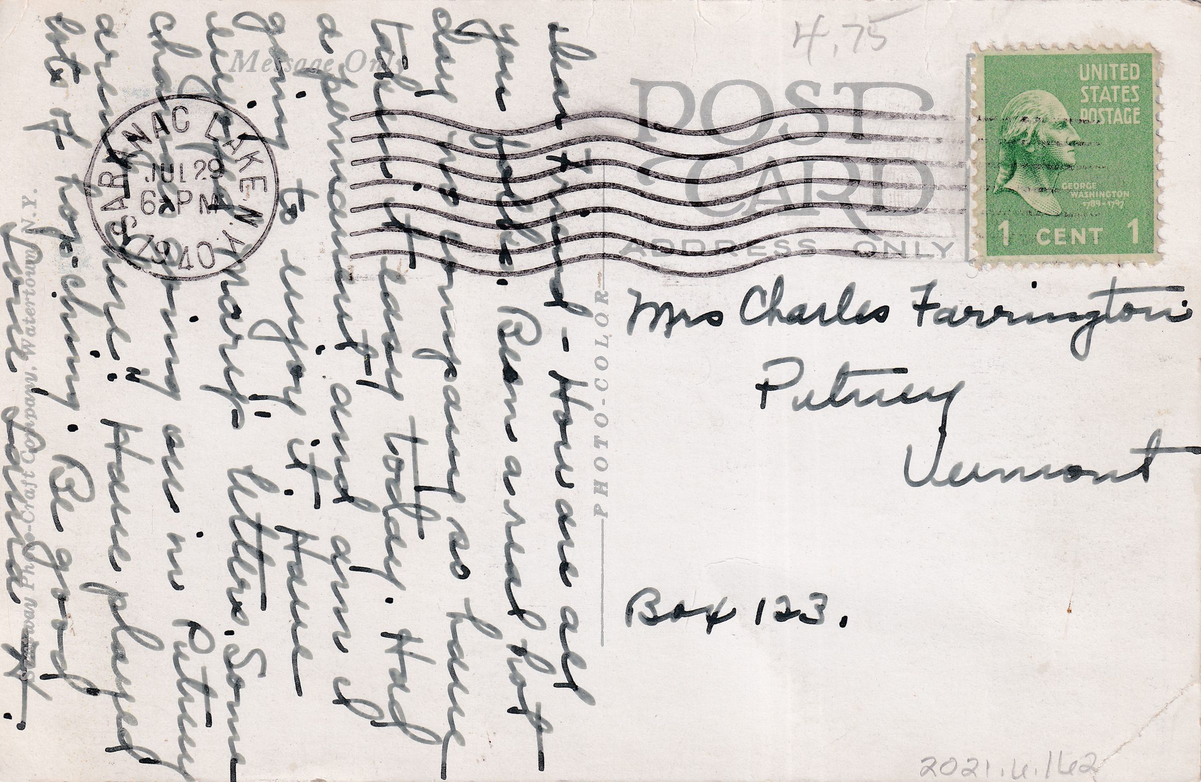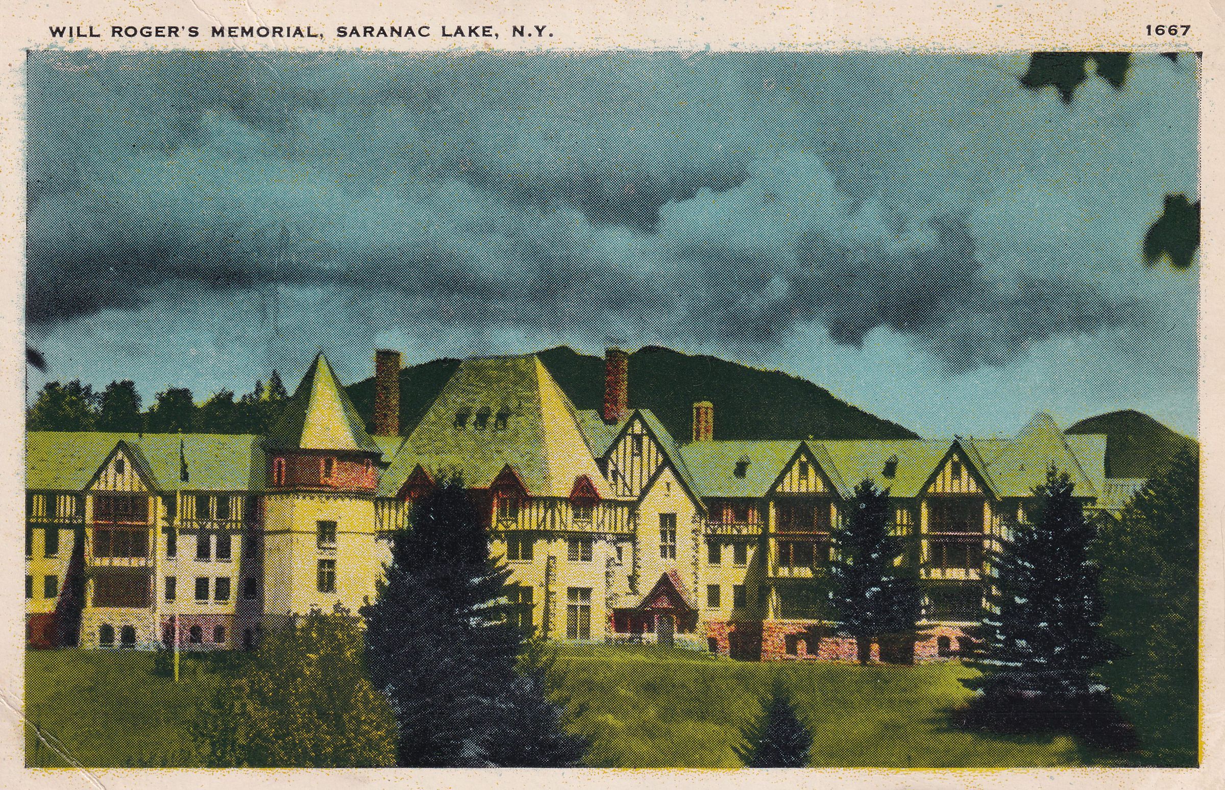 Color postcard showing the west elevation of Will Rogers Hospital. Printed caption on front reads, "Will Roger's Memorial, Saranac Lake, N.Y." Printed by the Santway Photo-Craft Company, Watertown, N. Y. Used, divided back, white border, postmarked Saranac Lake, July 29, 1940. Handwritten message on back reads, "Dear Friend, How are all you folks. Been a real hot day no company so have taken it easy today. Had a permanent and am I going to enjoy it. Have enjoyed Mary's letters. Some changes going on in Putney aren't there? Have played lots of hop-ching. Be good. Love, Laura H." Mailed to Mrs. Charles Farrington, Putney, Vermont, Box 123.Lexicon