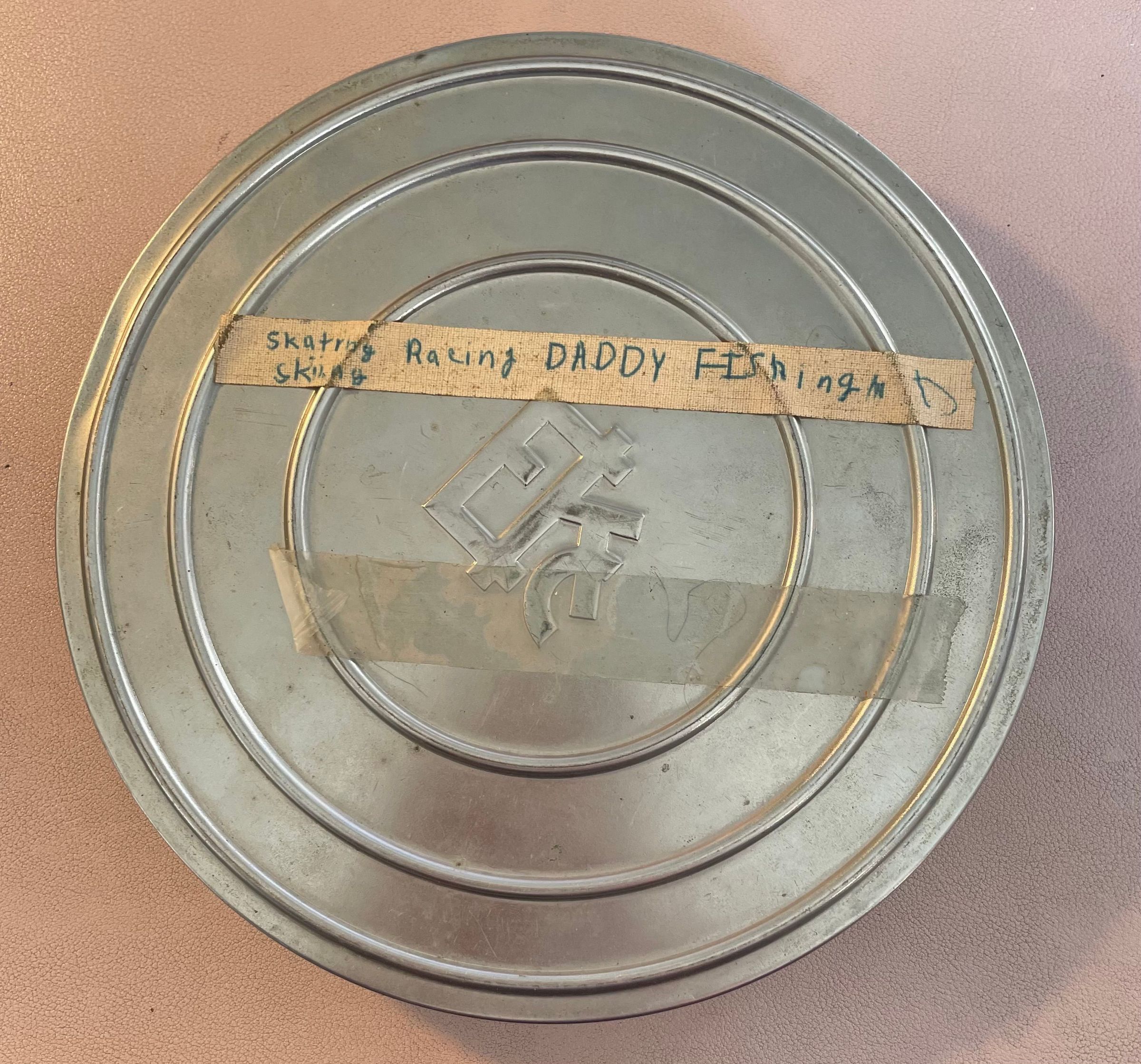 16mm film reel with label, "Skating, skiing, racing, daddy fishing." Recorded by family of Robert H. Baker in the early 1920s. Contains scenes of winter sporting events at Pontiac Bay, likely during Winter Carnival, including Ed Lamy jumping barrels. Also includes footage of children skiing and fishing, and track races.