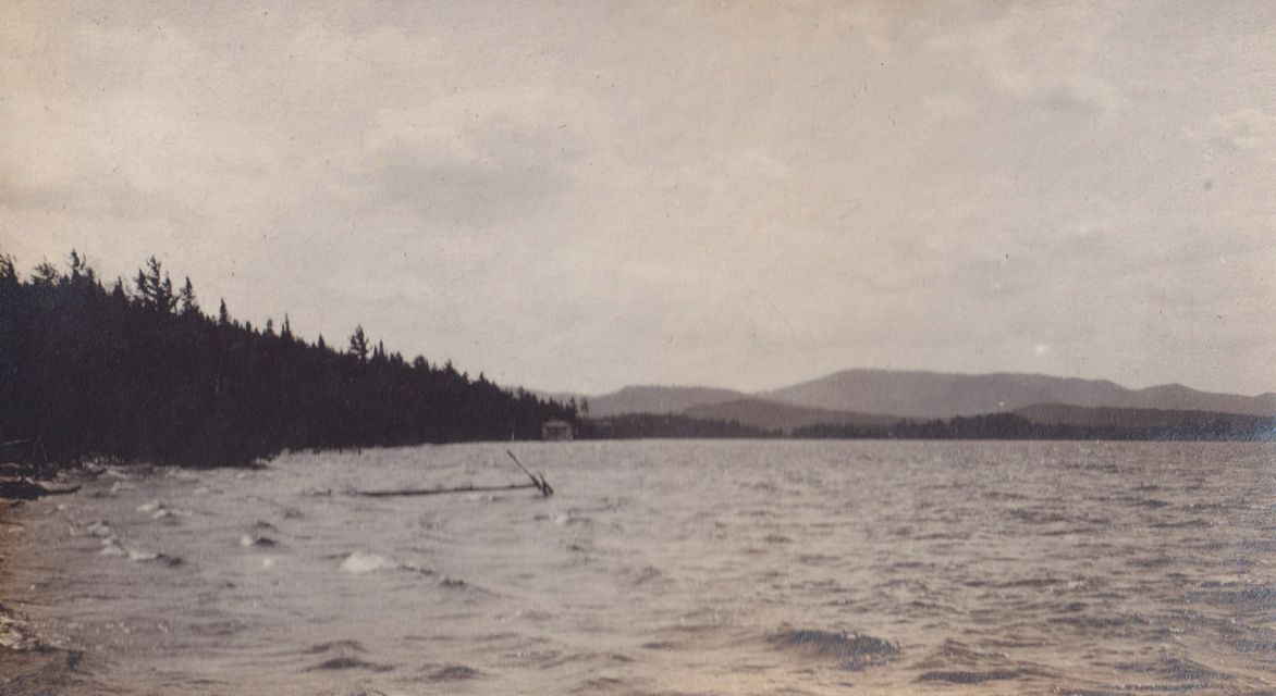 Black-and-white photograph of a lake taken from either a boat on the lake or the shore. Trees line the shore on the left side of the photograph, and hills can be seen behind the shore at the far end. There is a boathouse along the shore on the left side.