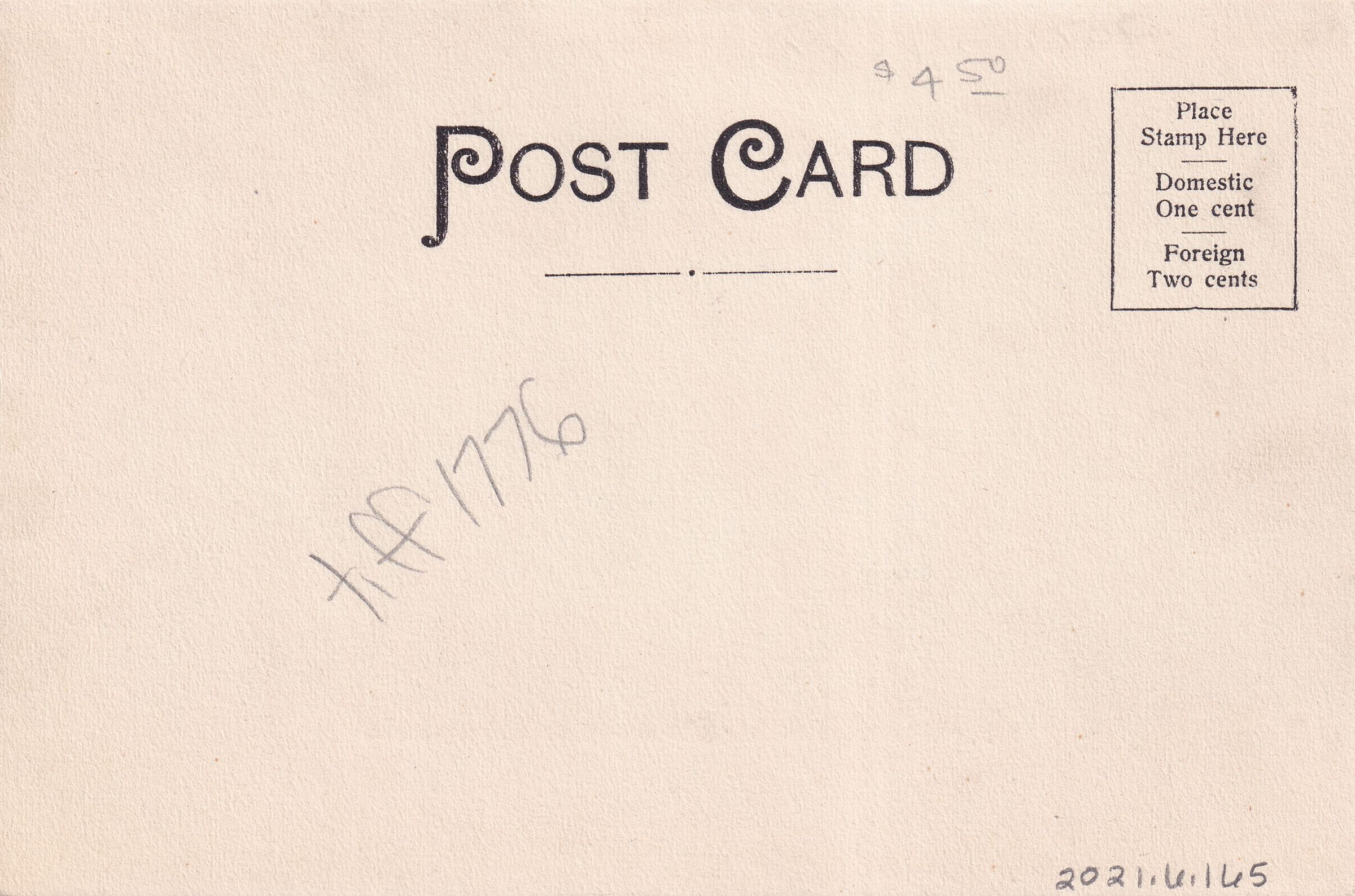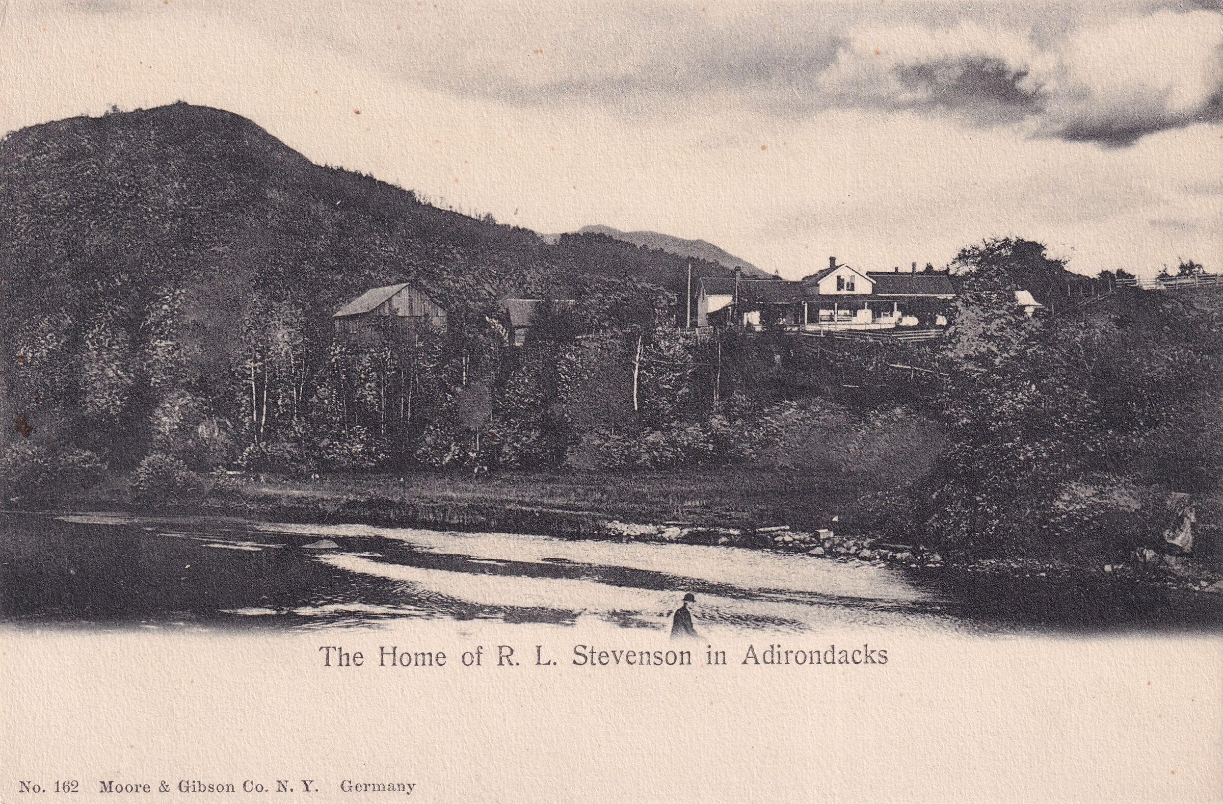 Black-and-white postcard showing the Baker Cottage, AKA the Robert Louis Stevenson Cottage, from across the Saranac River. A man is standing in the river. Mt. Baker is visible in the background. Printed caption on front reads, "The Home of R. L. Stevenson in Adirondacks." Printed by Moore & Gibson Co., N. Y. Unused, undivided back, white box on front.Subject Place
