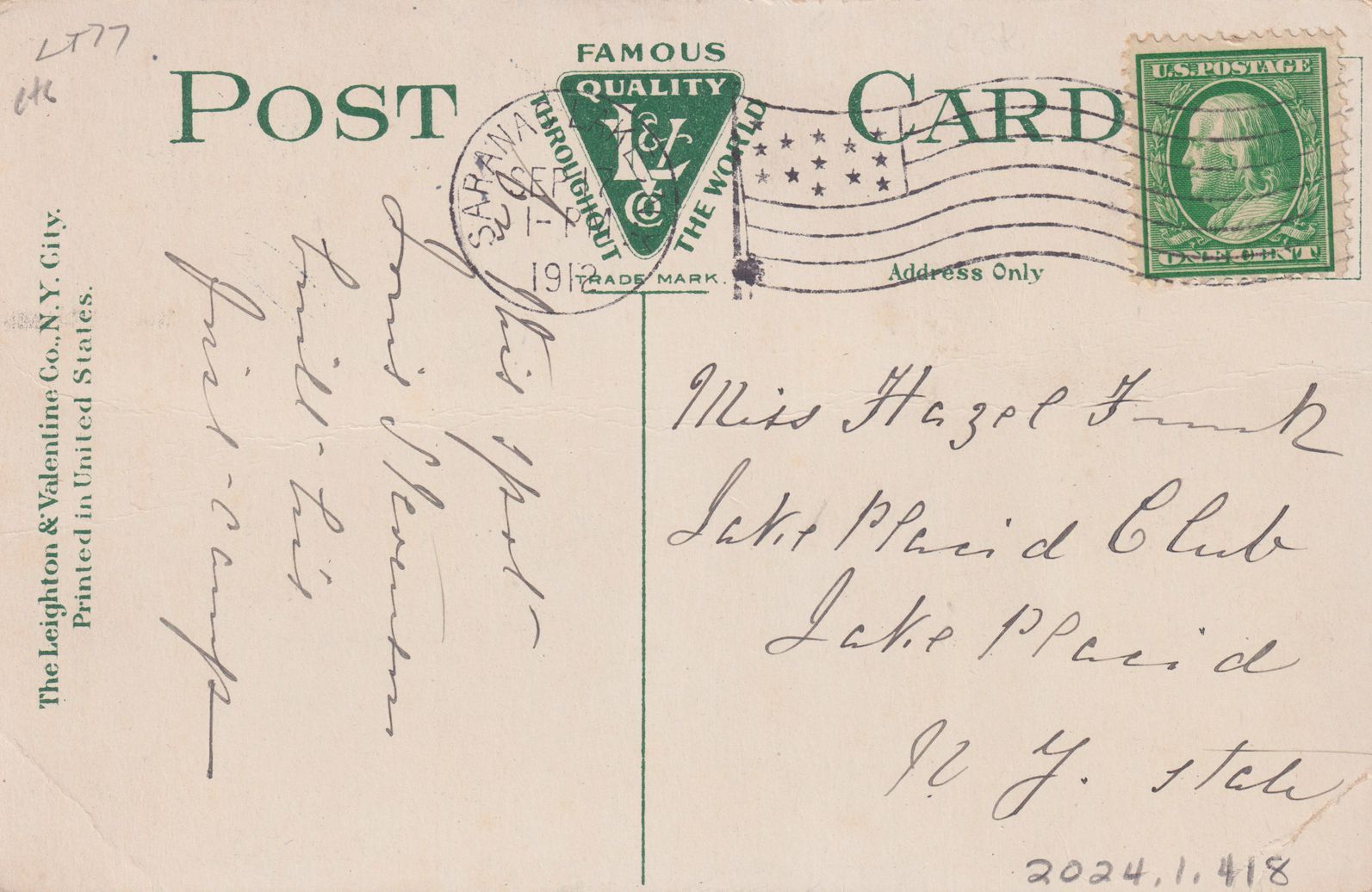 Postcard with an illustration of the Mellon Library at Trudeau Sanatorium. The postcard is addressed to Miss Hazel Frank.