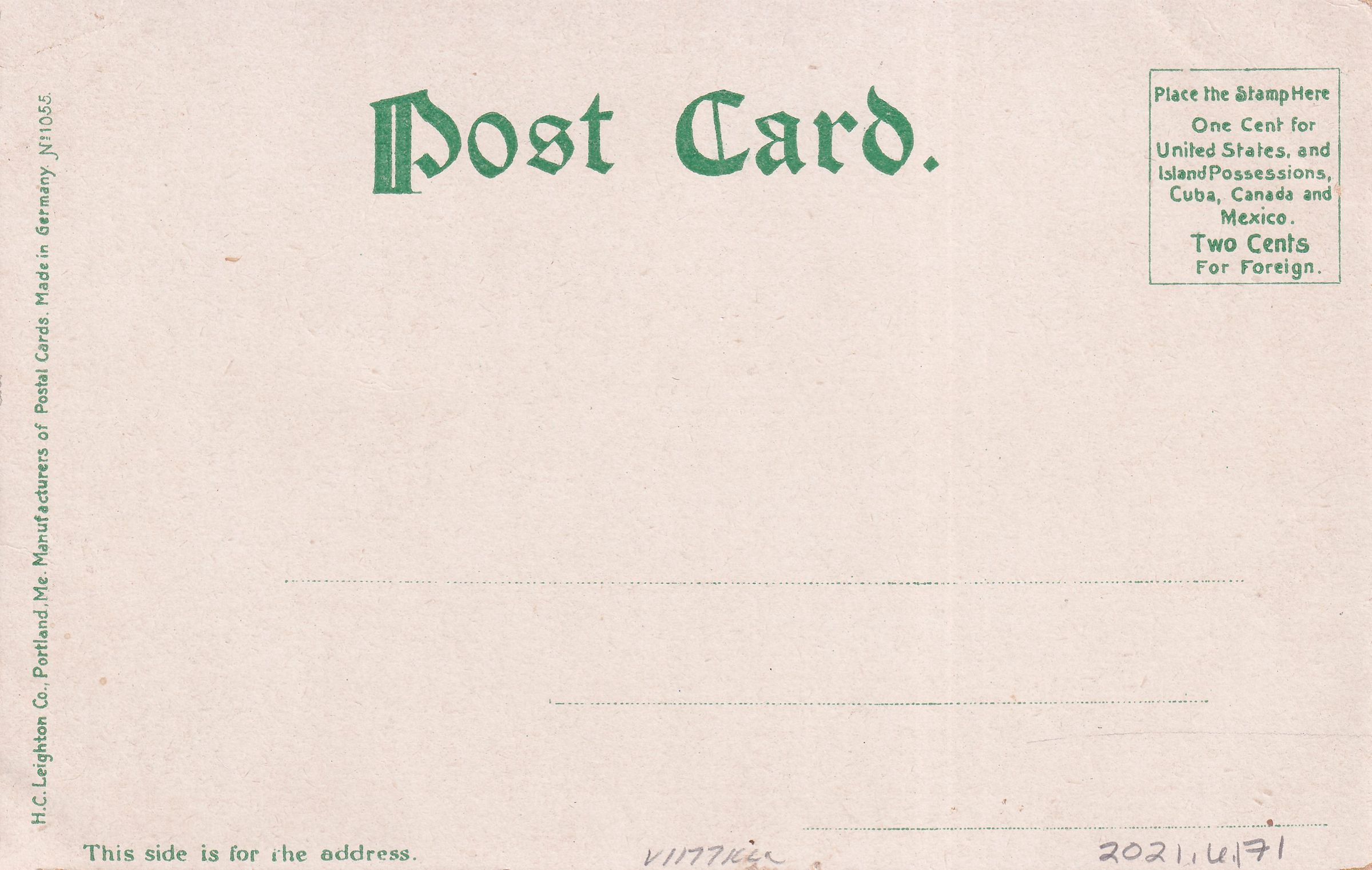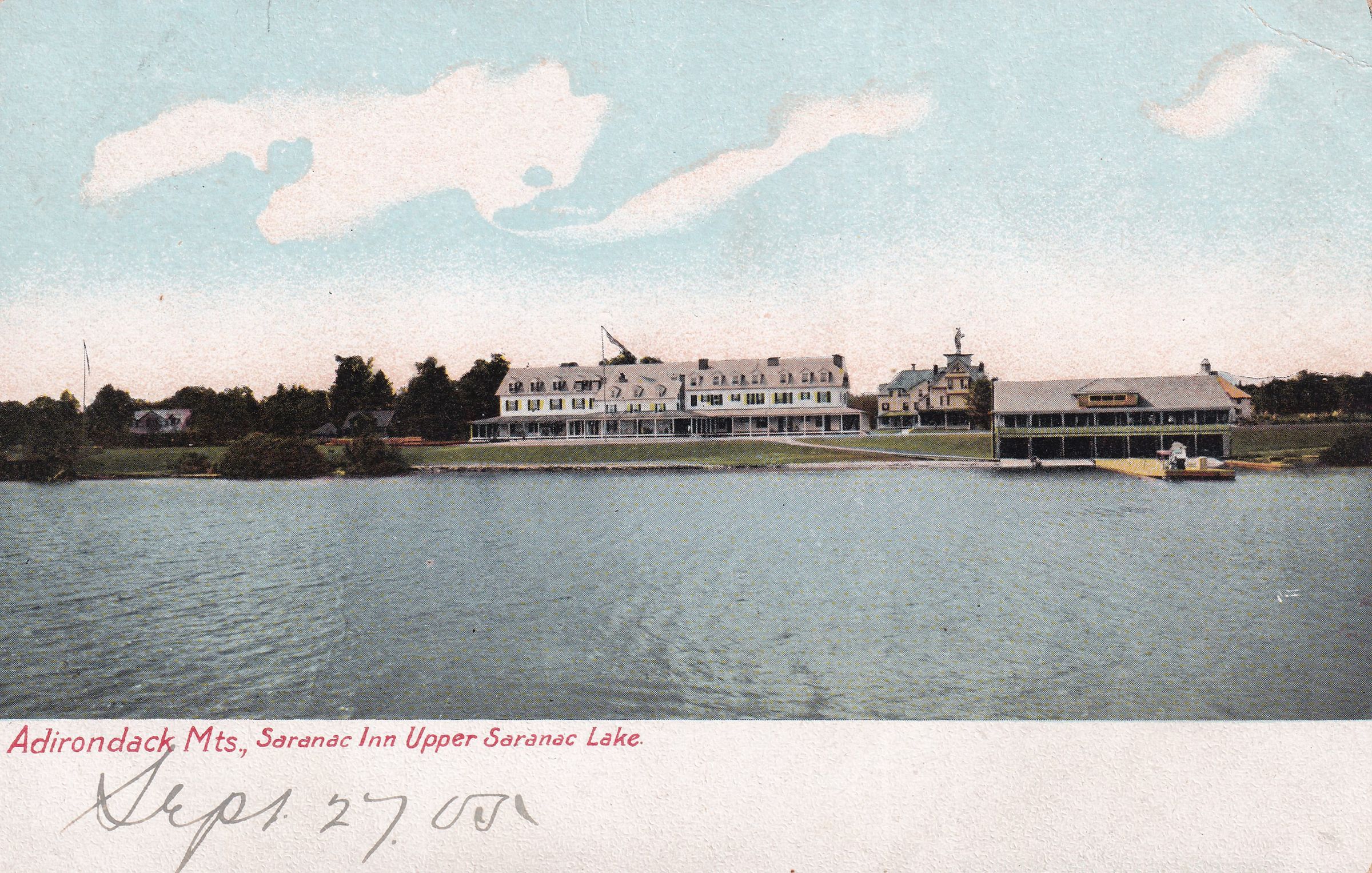 Color postcard showing the Saranac Inn property from the lake. The main building and casino/boat house are visible, as well as several of the cottages and outbuildings. Printed caption on front reads, "Adirondack Mts., Saranac Inn Upper Saranac Lake." Printed by H. C. Leighton Co., Portland, Me. Used, undivided back, white bar for message, not postmarked. Handwritten note on front reads, "Sept. 27, 05."Subject Place