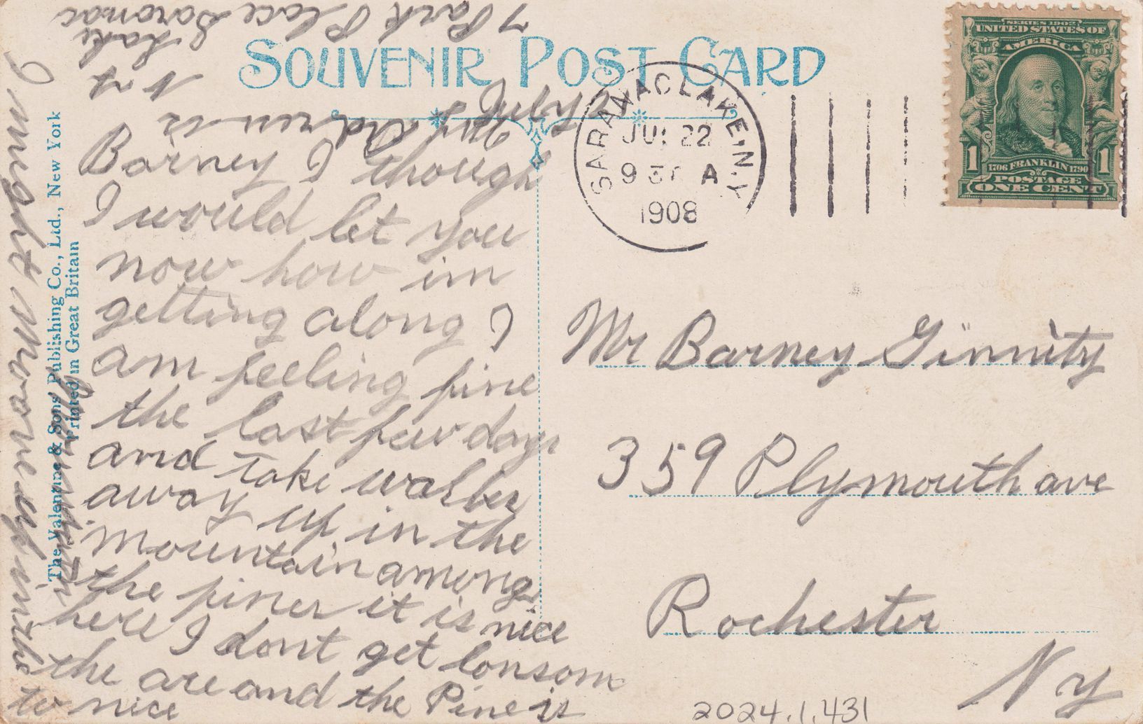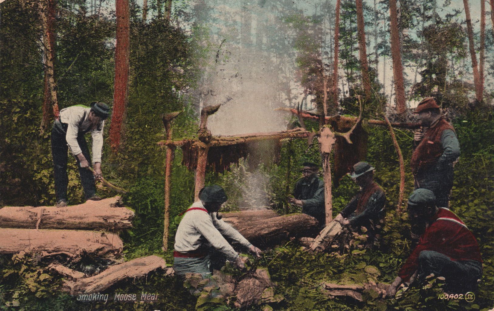 Postcard with an image of a group of men smoking moose meat. The postcard is addressed to Mr. Barney Ginnity.