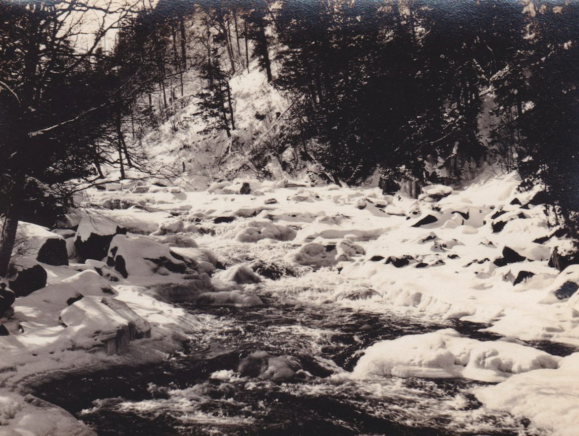 Black-and-White photograph of an unidentified river flowing through a snowy landscape. The photograph was likely printed by Kollecker's Kodak and Gift Shop.