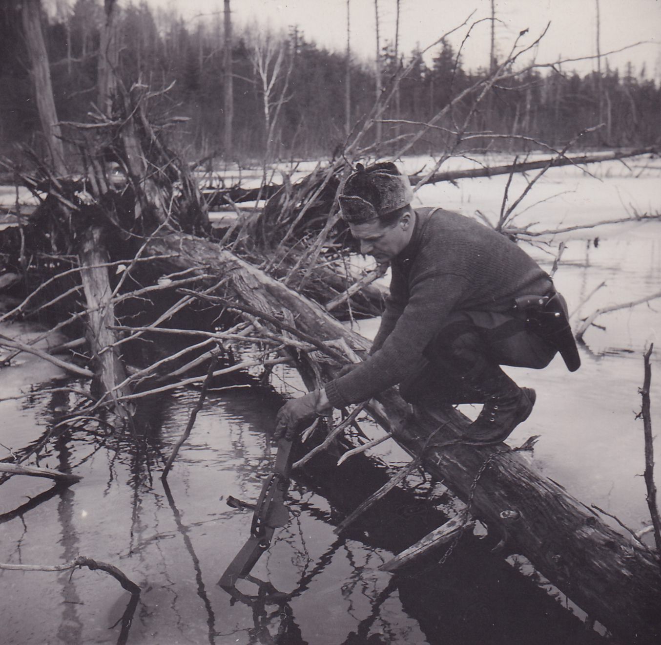 Black-and-White photograph of Carl Prue in a game warden uniform, squatting down on a log to retrieve an animal trap from a body of water.