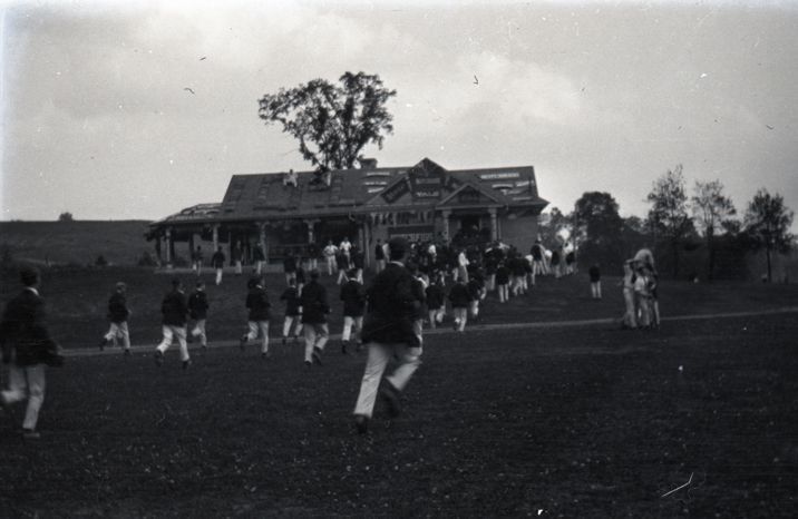 Negative of many unidentified young men running on the lawn of a house coated in "Hotchkiss" and "Hill" flags. Most likely taken by Mary Ives Baldwin. This item is not fully cataloged but has been uploaded so the image is publicly available; if you would like us to prioritize cataloging this item, please contact the HSL Collections team.