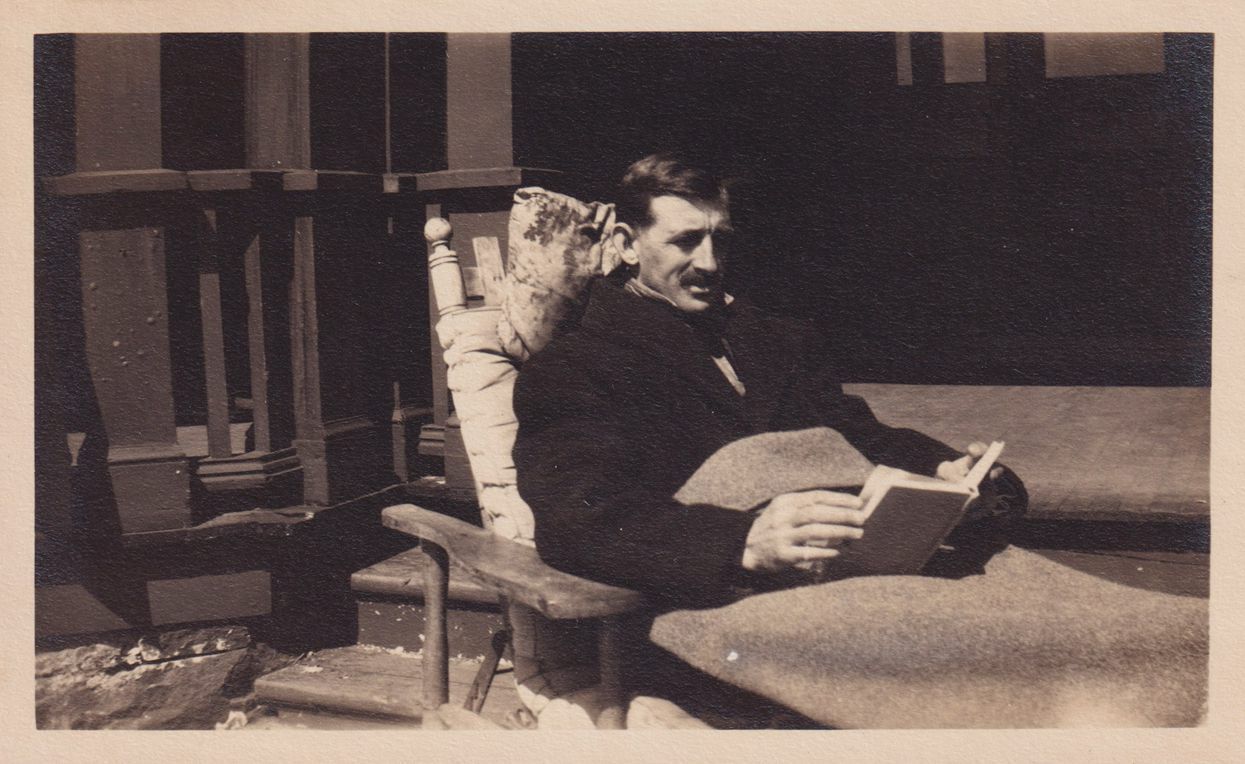 Black-and-White photograph of an unidentified man reading a book, seated in a cure chair. The chair appears to be on the ground just in front of a porch. The photograph was likely printed by Kollecker's Kodak and Gift Shop.