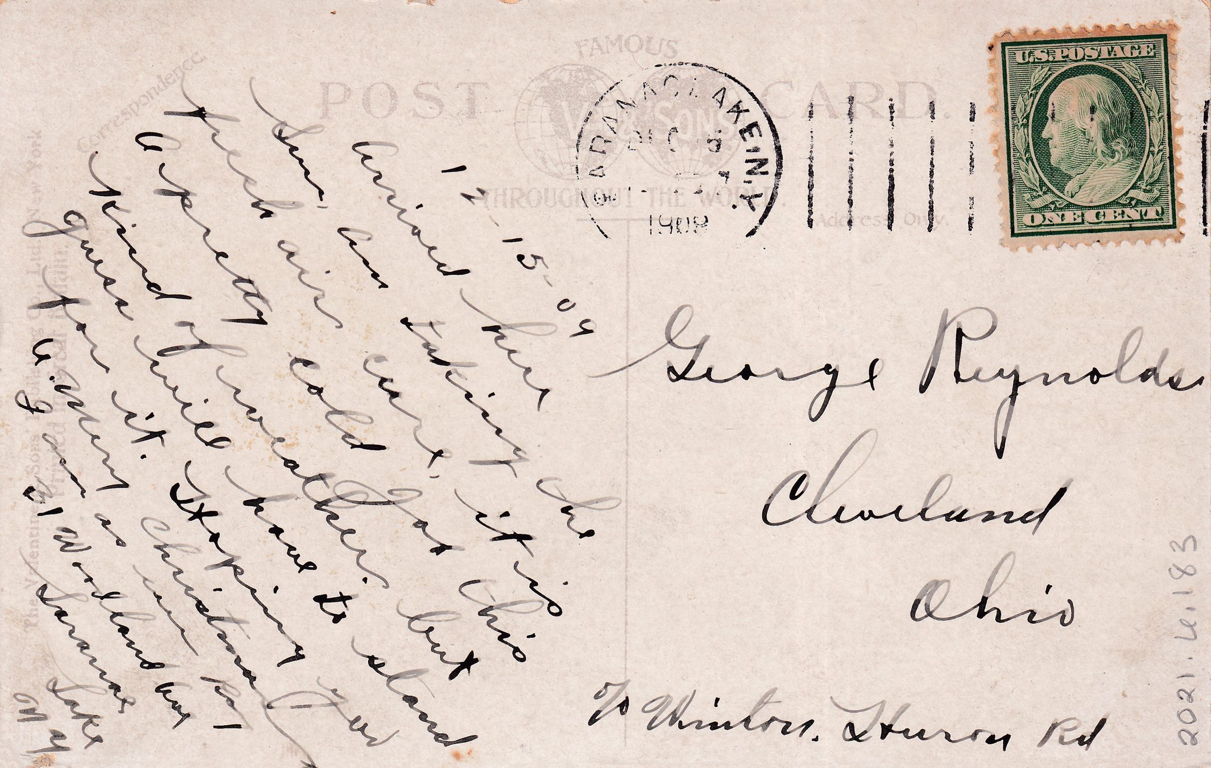 Color postcard showing the south face of Baker Chapel at the Adirondack Cottage Sanitarium (later renamed Trudeau Sanatorium). There are paths leading through the grounds up to the Chapel. Printed caption on front reads, "The Chapel, Adirondack Cottage Sanitarium, Saranac Lake, N.Y." Printed by the Valentine & Sons' Publishing Co., Ltd., New York. Used, divided back, postmarked Saranac Lake, December 15, 1908. Handwritten message on back reads, "12-15-09. Arrived here Sun. Am taking the fresh air cure, it is a pretty cold job this kind of weather, but guess will have to stand for it. Hoping you a merry Christmas. I am as ever, Roy. 31 Woodland Ave., Saranac Lake, NY." Mailed to George Reynolds, Cleveland, Ohio, c/o Winton, Henry [?] Rd.Subject Place