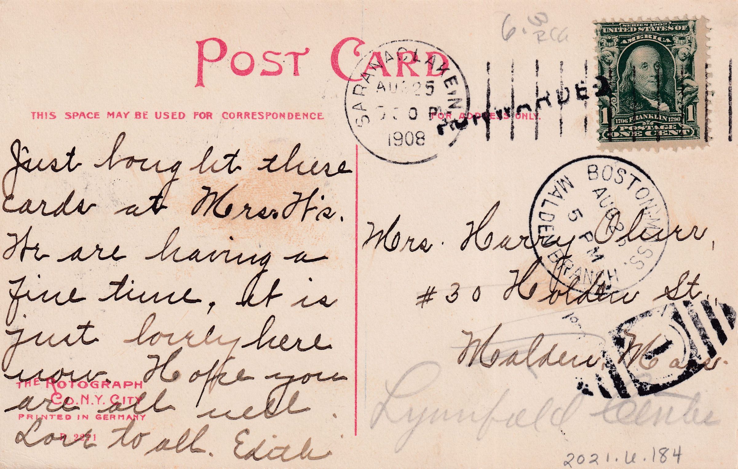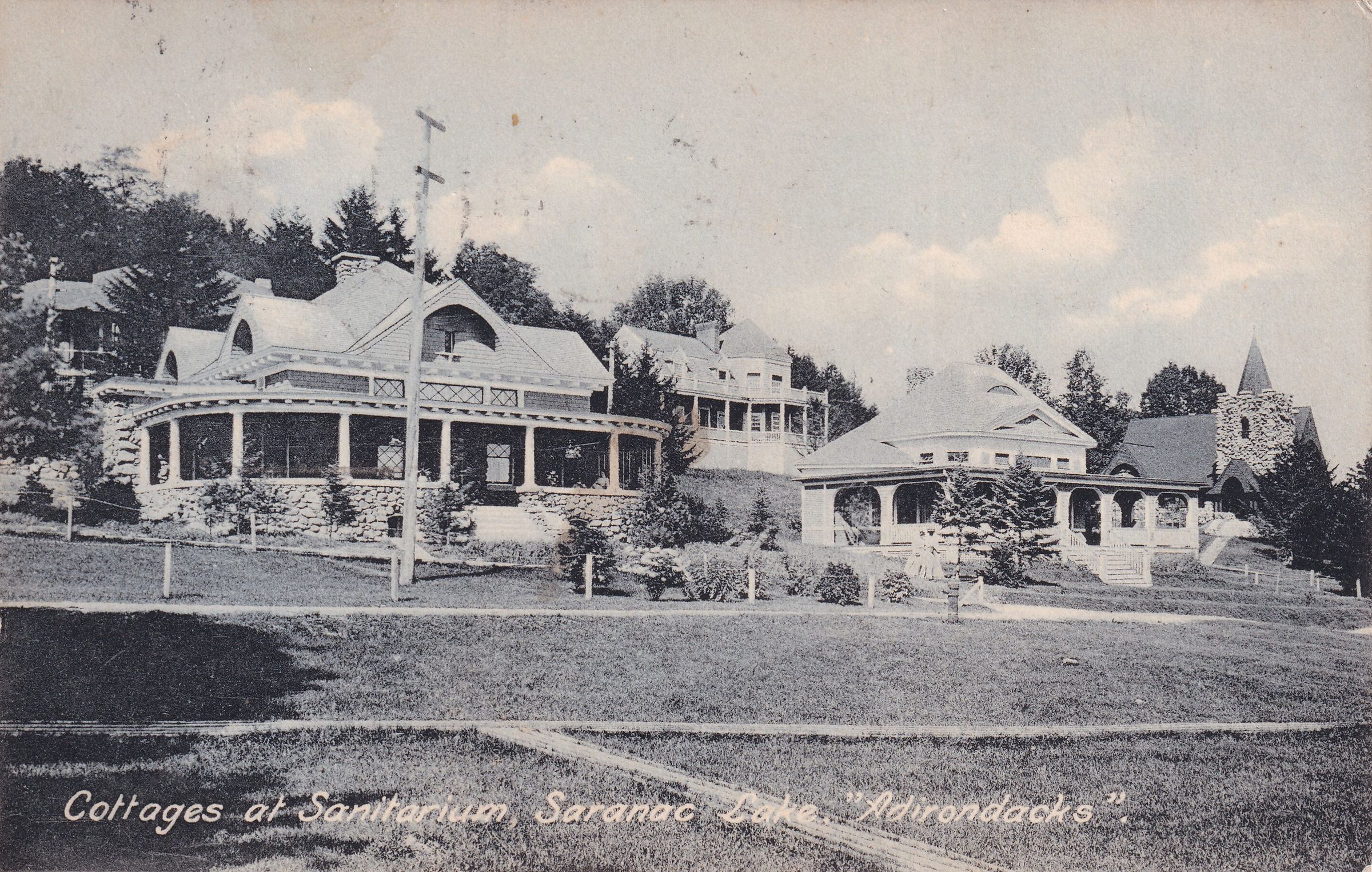 Black-and-white postcard showing the Ladd and Anderson Cottages at the Adirondack Cottage Sanitarium (later renamed Trudeau Sanatorium). Printed caption on front reads, "Cottages at Sanitarium, Saranac Lake, 'Adirondacks'." Printed by the Rotograph Co., NY City. Used, divided back, postmarked Saranac Lake, August 25, 1908. Handwritten message on back reads, "Just bought these cards at Mrs. H's. We are having a fine time, it is just lovely here now. Hope you are all well. Love to all, Edith." Mailed to Mrs. Harry Olivery, #30 Holden St., [crossed out: Malden], Lynnfield Centre, Mass."Subject Place