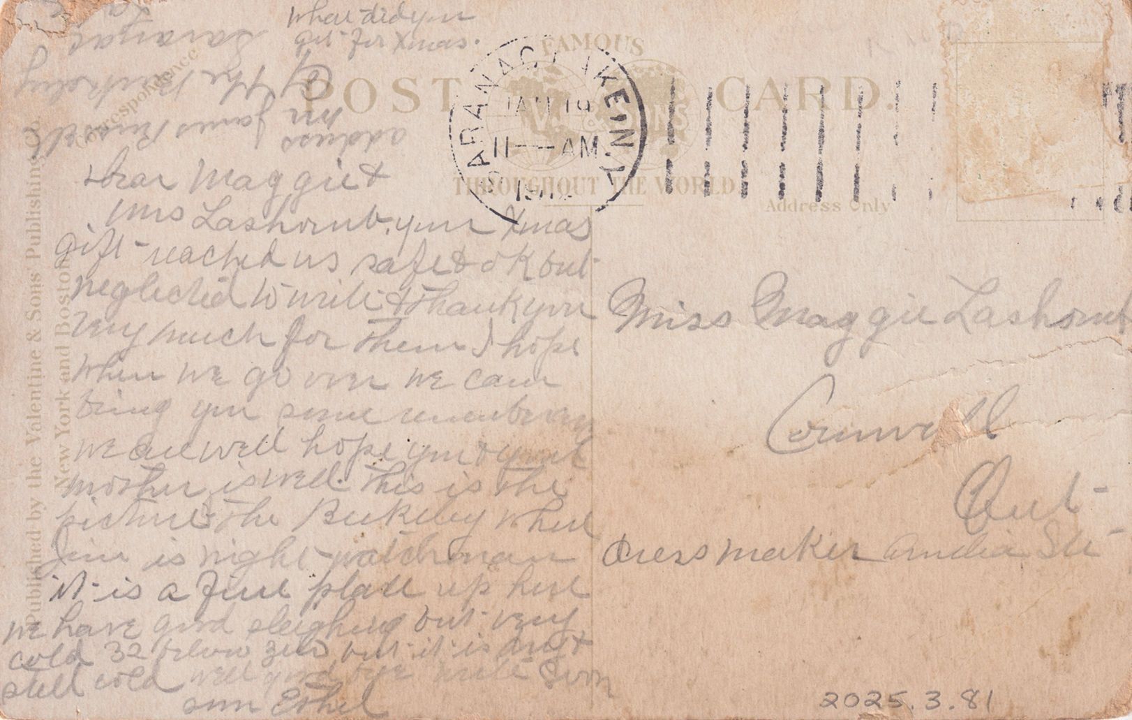 Handwritten message on reverse reads, "Dear Maggie and Mrs. Lashond. Your Xmas gift reached us safe & ok but neglected to write & thank you very much for them. I hope when we go over we can bring you some remembrances. We are well hope you & your mother is well. This is the picture the Berkeley where Jim is night watchman. It is a fine place up here. We have good sleighing but very cold 32 below zero but it is dry & still cold. Well good bye. write soon. Am Ethel." Mailed to Miss Maggie Lashond, Cornwall, Ont. dressmaker Amelia St.Subject Place